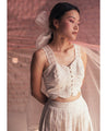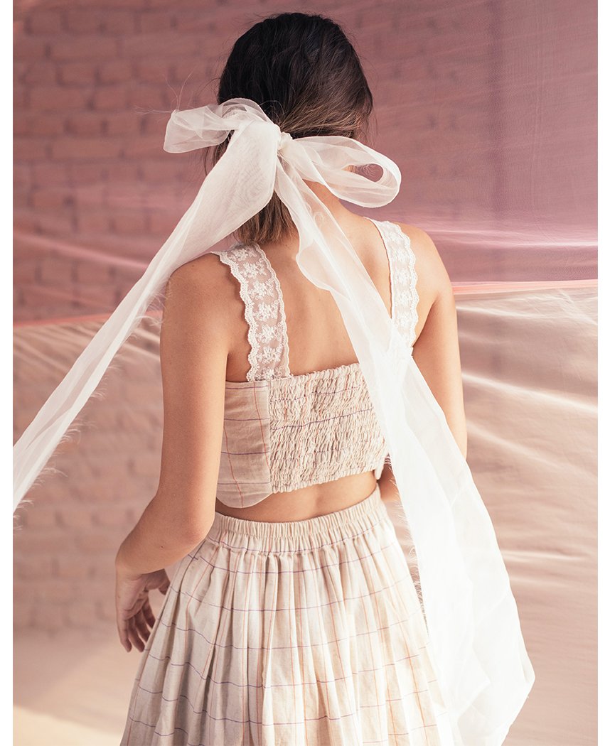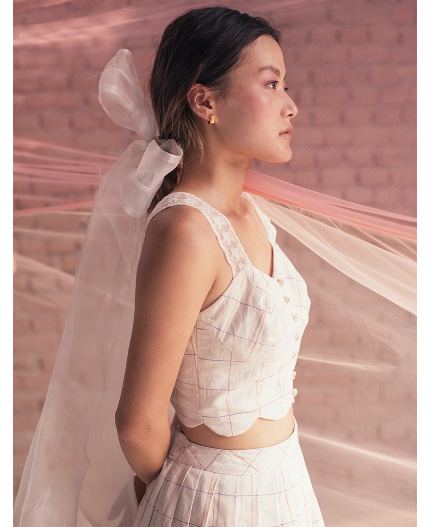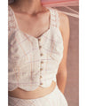 A scallop hem bustier top with hand block printed pastel checks. Features lace straps, embroidered buttons and a smocked back. Length 16". The model is 5'6" and is wearing size S. Made in 100% cotton.