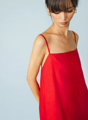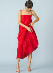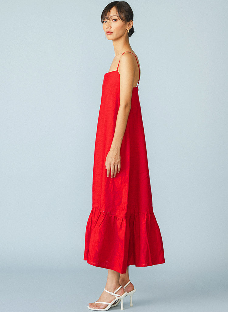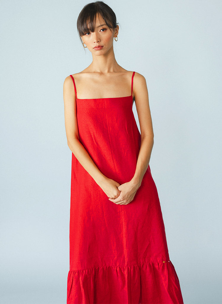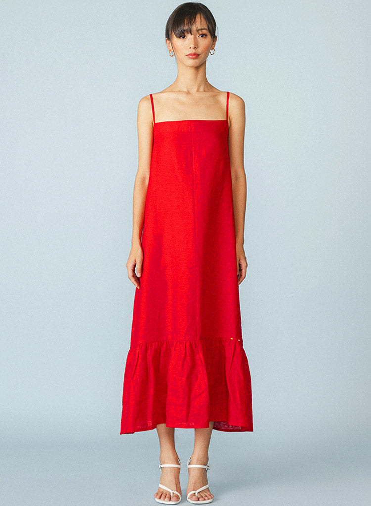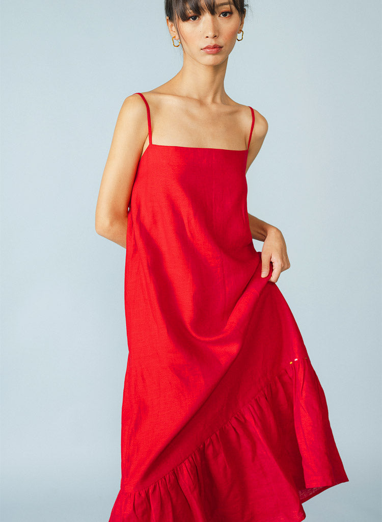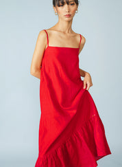 A straight-fitting midi dress with a layer of gathered hem and spaghetti shoulder straps featuring a square neckline. Length 41". The model is 5'4", and is wearing size XS.