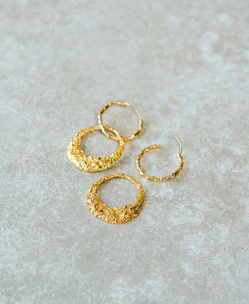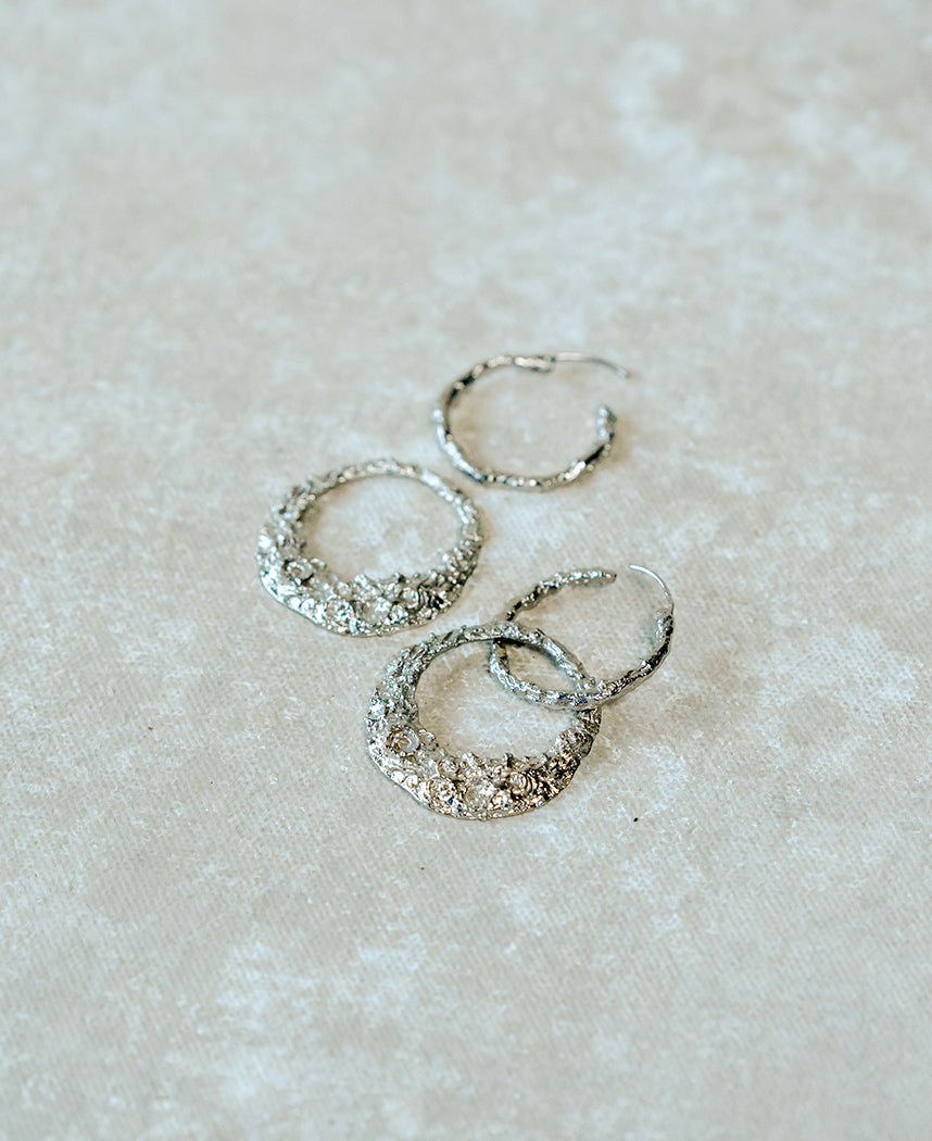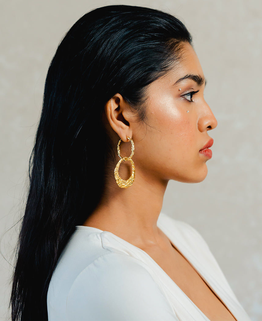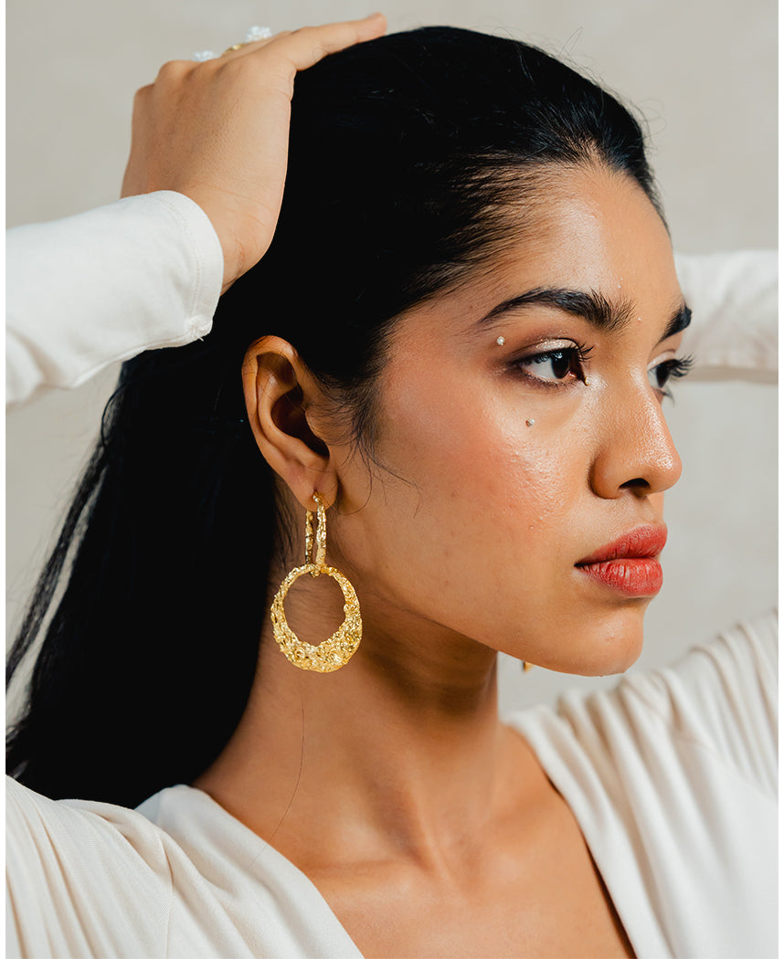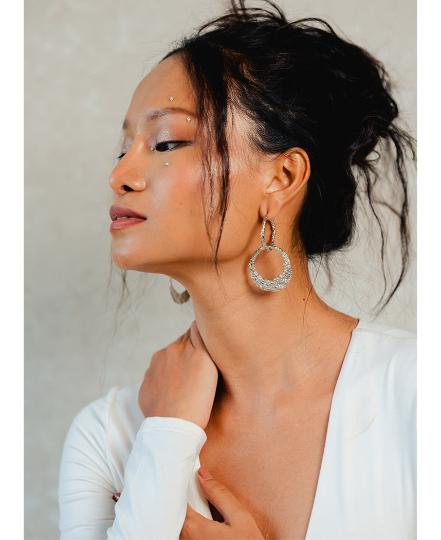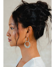 A pair of drop earrings with two circular hoops. Size 6.5 cm. Handcrafted in brass with nickel plating.