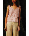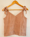 A playful slip top made in handwoven mulberry silk with tie-up straps. Features a V-neck and short side slits. Length 20".