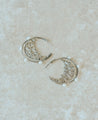 A pair of crescent-shaped hoops embellished with glass beads. Size 6 cm. Handcrafted in brass with nickel plating.