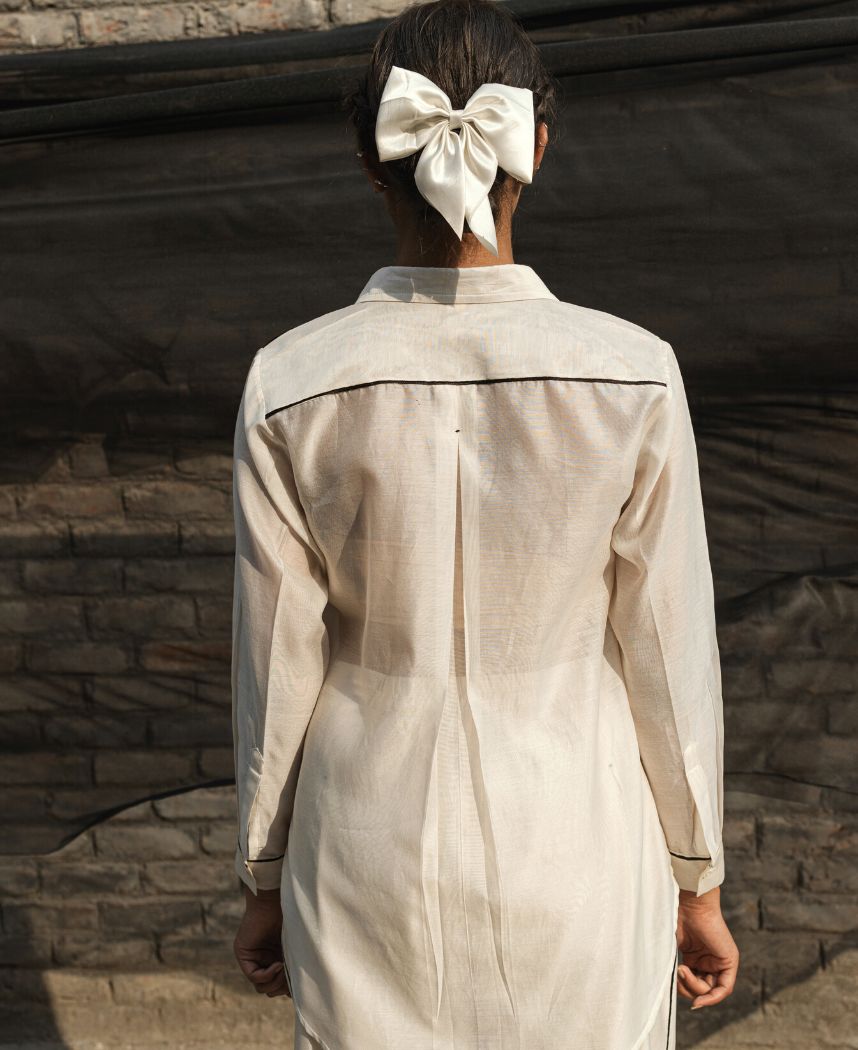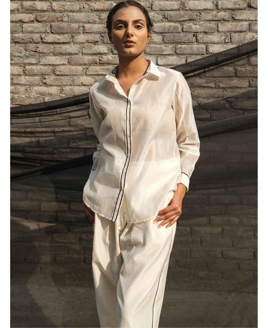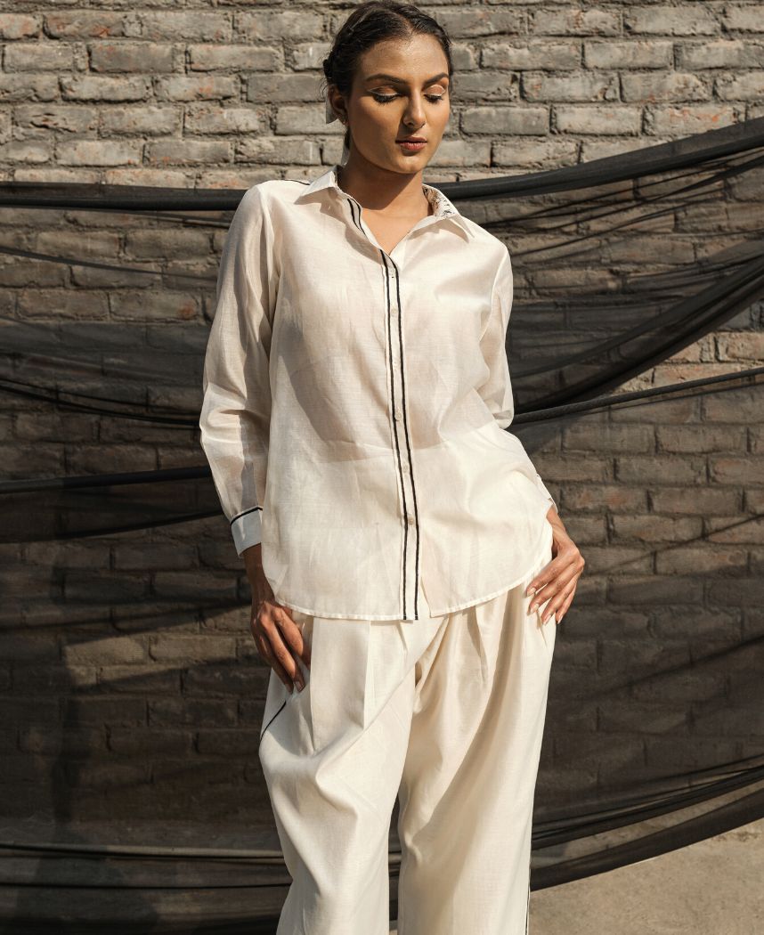 A two piece set pairing the Rue Shirt and the Daphne Pants. The classic shirt with tape detailing on yoke, placket & cuffs features a pointed collar and a front button placket. Length 28". The classic straight fit pants with tape detailing feature a fitted front, elasticated back and inseam pockets. Length 39". Comes with a cotton lining. The model is 5'8" and is wearing a size M.