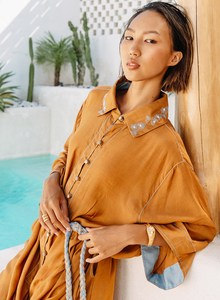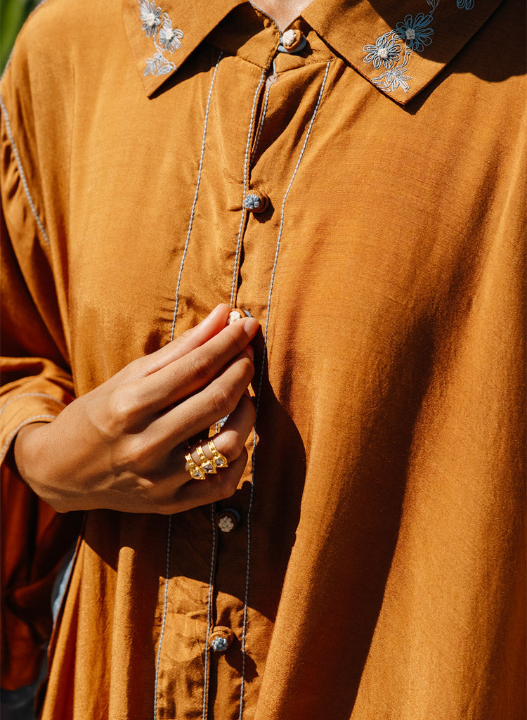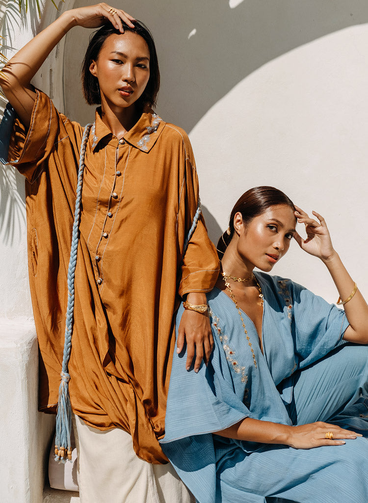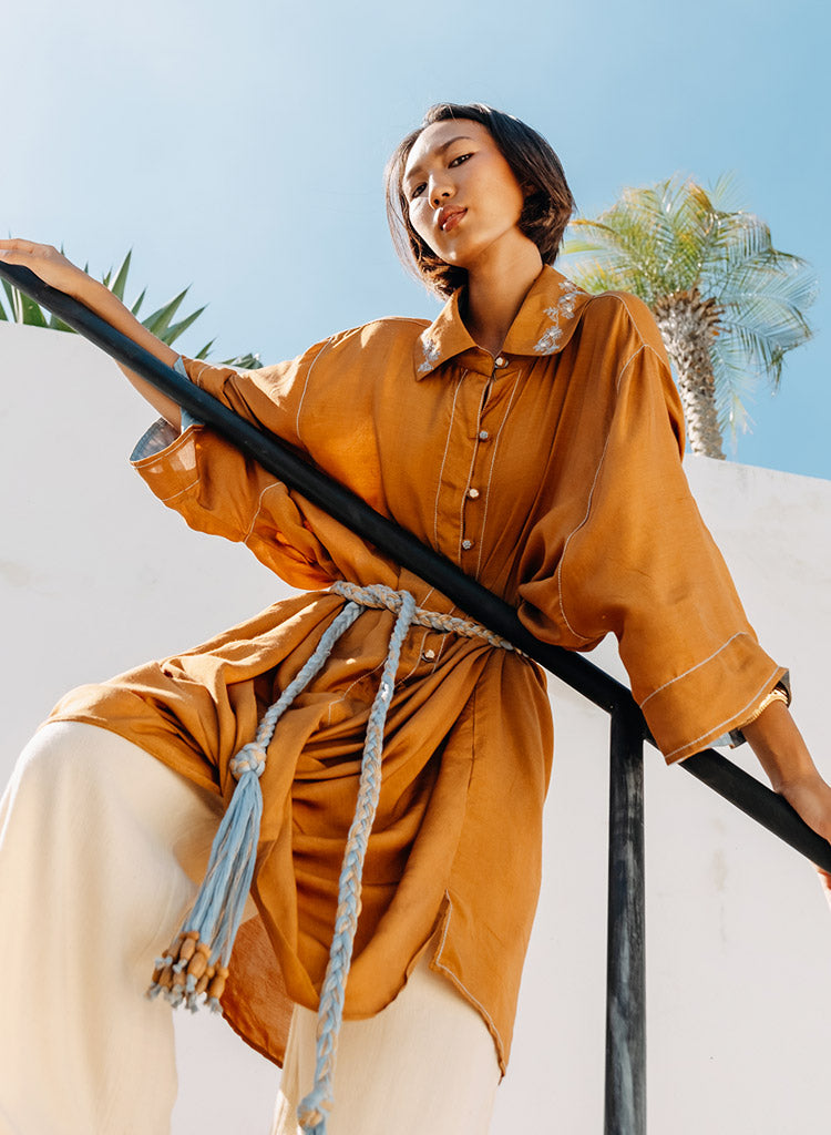 A two piece set pairing the Rustic Amore Tunic and the Curved Hem Pants. The cowl tunic is a hand draped ensemble featuring embroidered collar and buttons to add the unique touch. Length 35". Made in Muslin silk. The solid straight pants feature a curved hem at the bottom with half elasticated belt and curved insert pockets. Length 36". Made in Kala cotton.