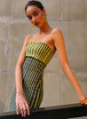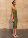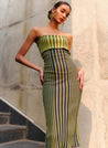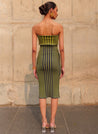 A fitted midi tube dress with a striped texture featuring a folded flap on the bodice. Length 48". The model is 5'9" and is wearing size S.