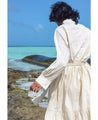 A tiered maxi dress with a self checkered print featuring a mandarin collar, a front button placket and inseam pockets. Comes with a fabric belt. Length 55". The model is 5'7" and is wearing a size M.