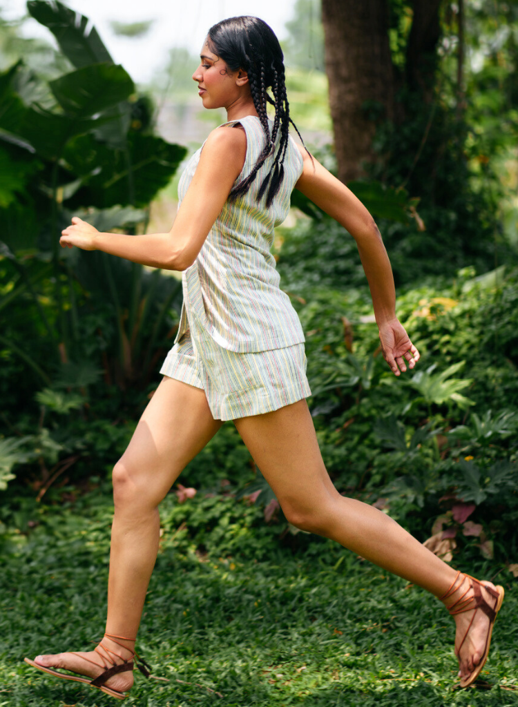 A two-piece set pairing the Sage Vest and the Sage Shorts. The classic tie-up vest features a V-neckline, shell button closure and delicate bead embroidery. Length 26". The relaxed fitting high-waisted shorts feature a side zipper and functional patch pockets for added utility. Length 15". The model is 5'7" and is wearing size S.