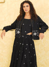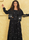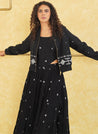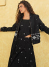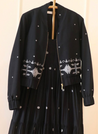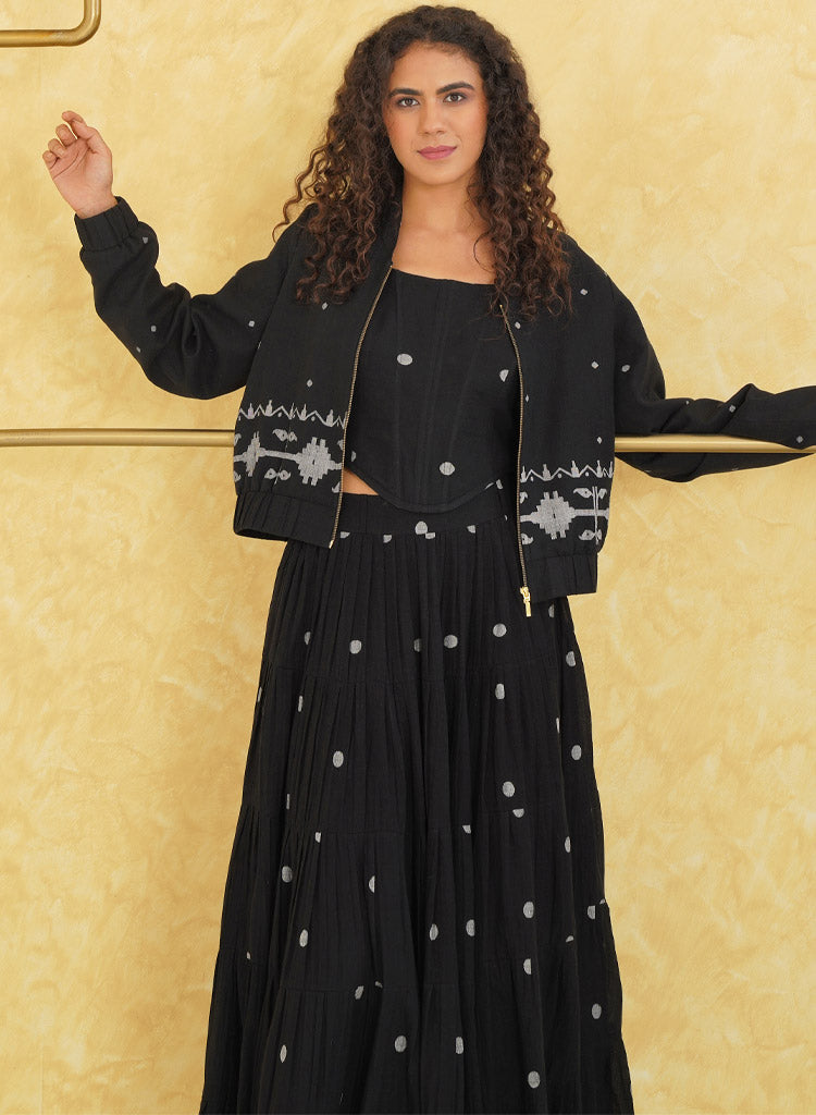 A Jamdani bomber jacket with a zipper featuring elasticated sleeves. Length 22". The model is 5'8" and is wearing size S.