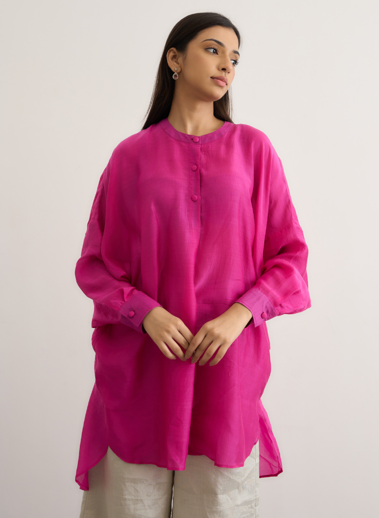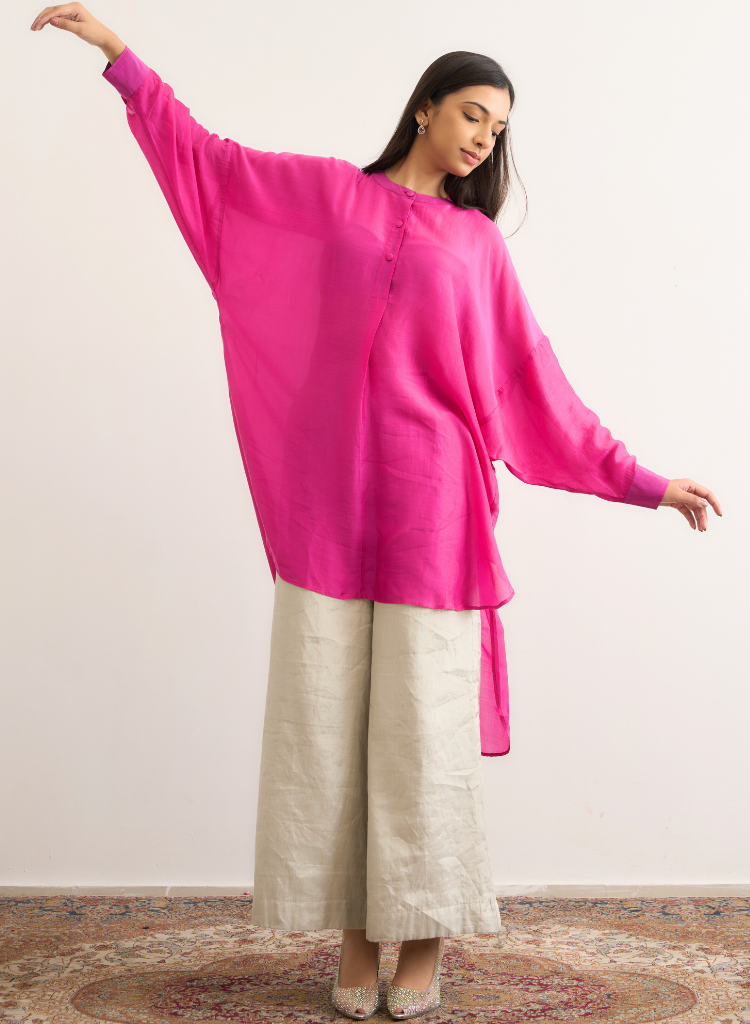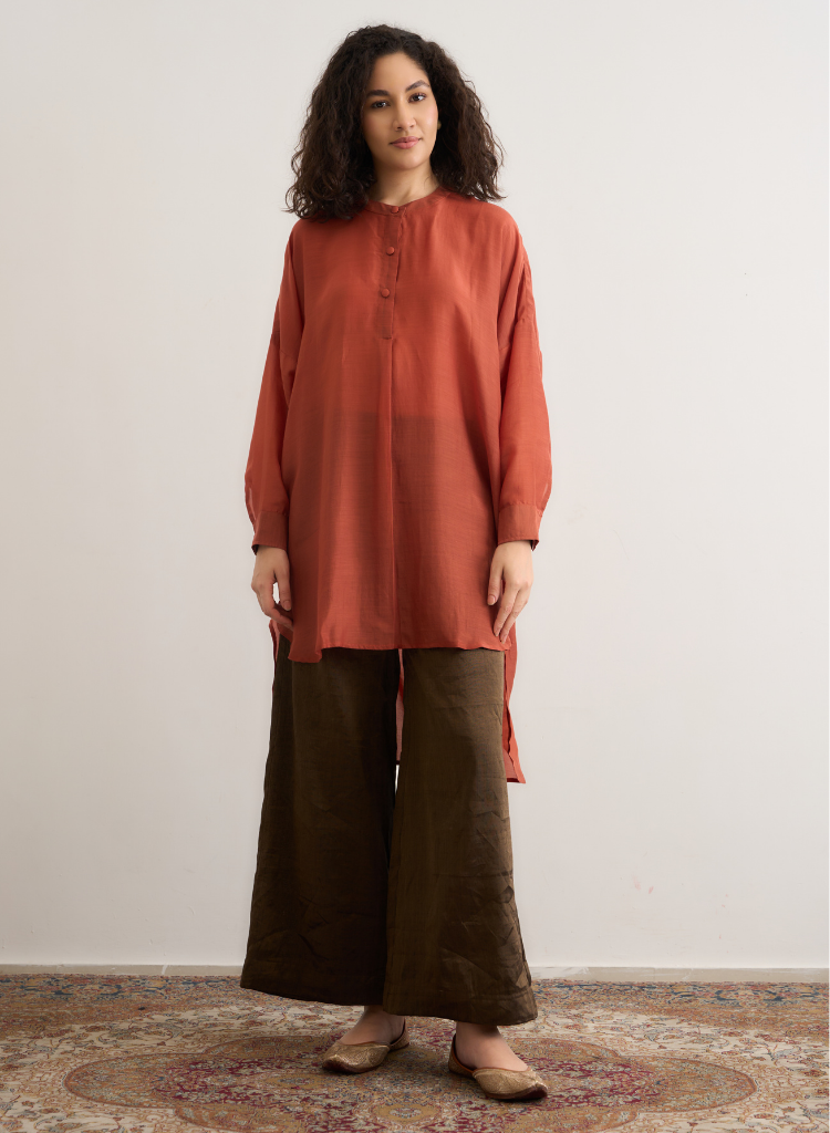 A two-piece set pairing the Salvia Top and the Daffodil Tissue Trousers. The relaxed fitting tunic with a high low hem features a round neck, a half button placket and long cuffed sleeves. Length 30". Made in cotton silk. The flared metallic pants feature an elasticated waist and inseam pockets. Length 39". The model is 5'8" and is wearing a size S.