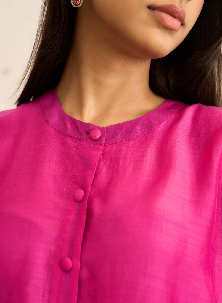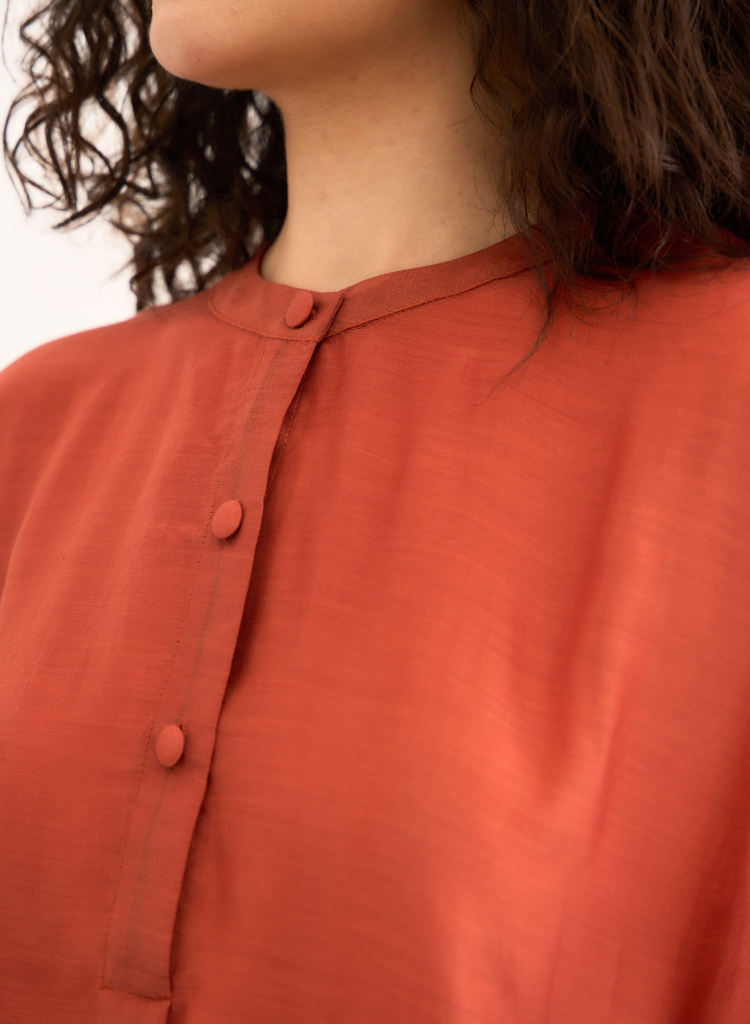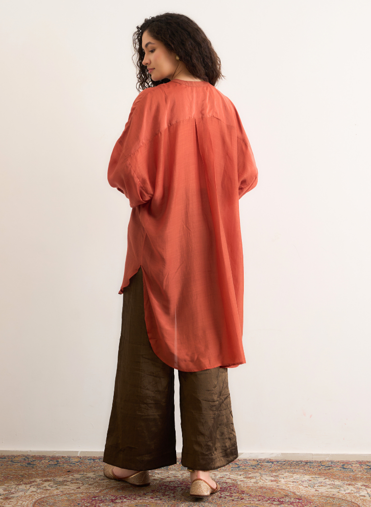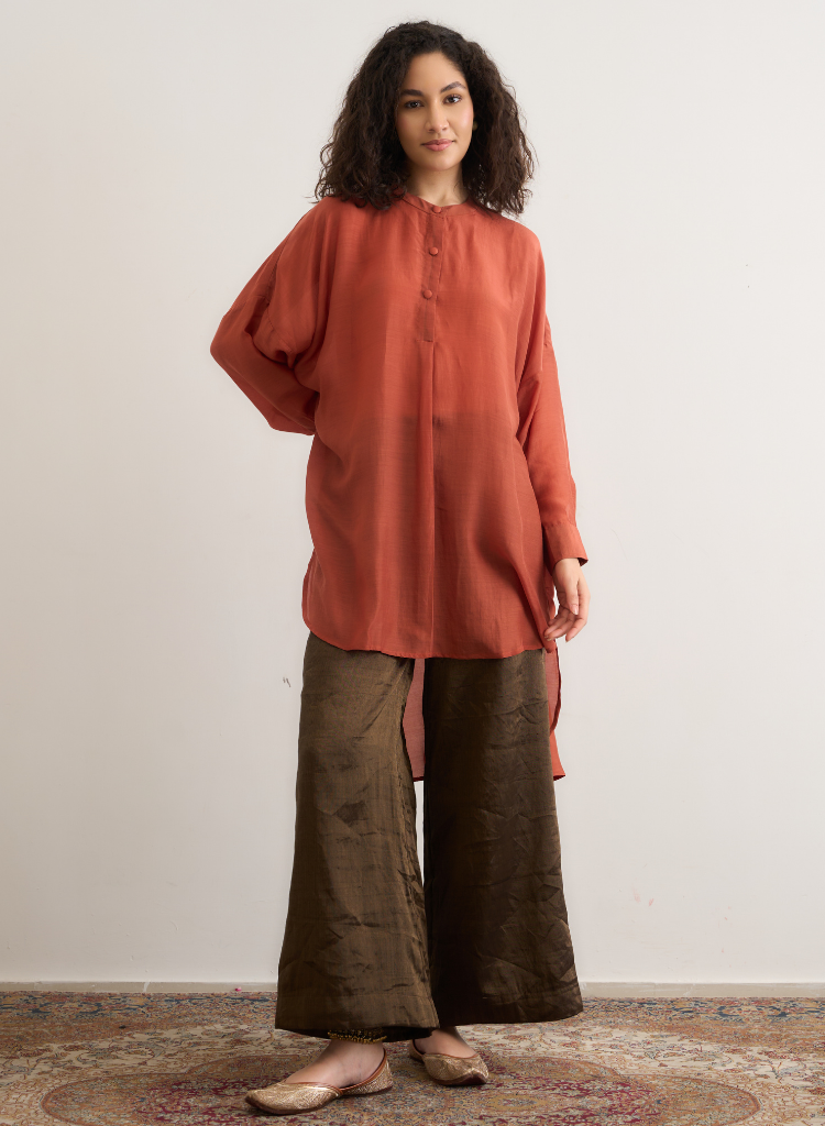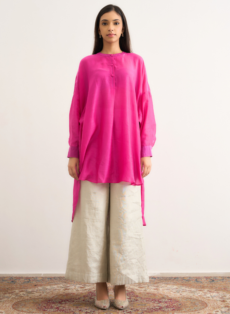 A relaxed fitting tunic with a high low hem featuring a round neck, a half button placket and long cuffed sleeves. Length 30". The model is 5'8" and is wearing a size S.