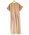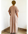 A relaxed fitting maxi dress featuring a round neck, a front button placket, cuffed sleeves and inseam pockets. Length 53".
