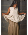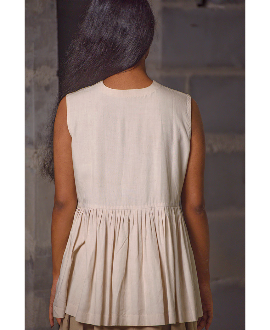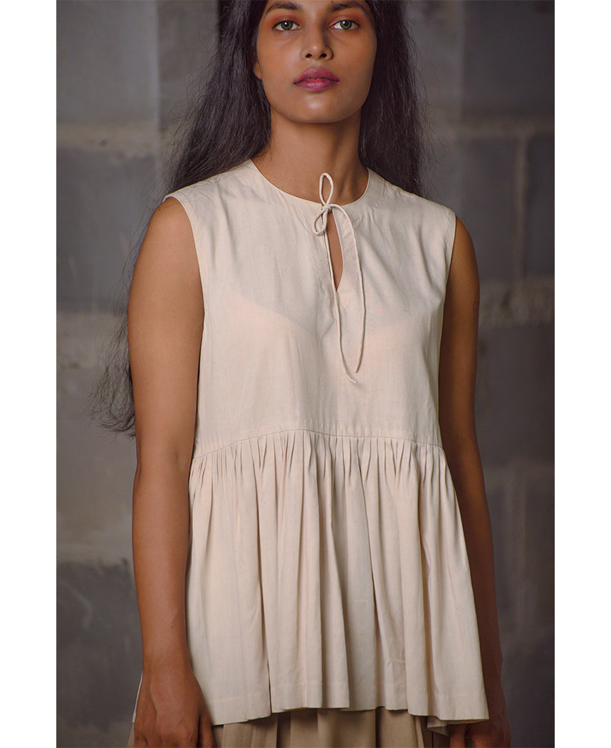 A sleeveless top with pleats at the waist featuring a round neck with a tie-up. Length 26". The model is 5'5" and is wearing size M.