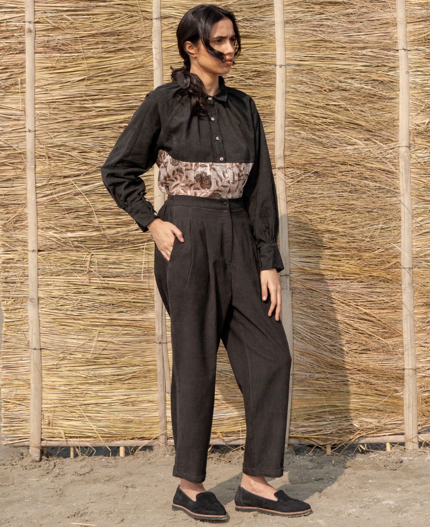 Classic fold-hem trousers with pleat details featuring a front zipper, elasticated back and inseam pockets. Length 35". The model is 5'7" and is wearing a size S.