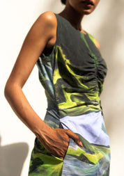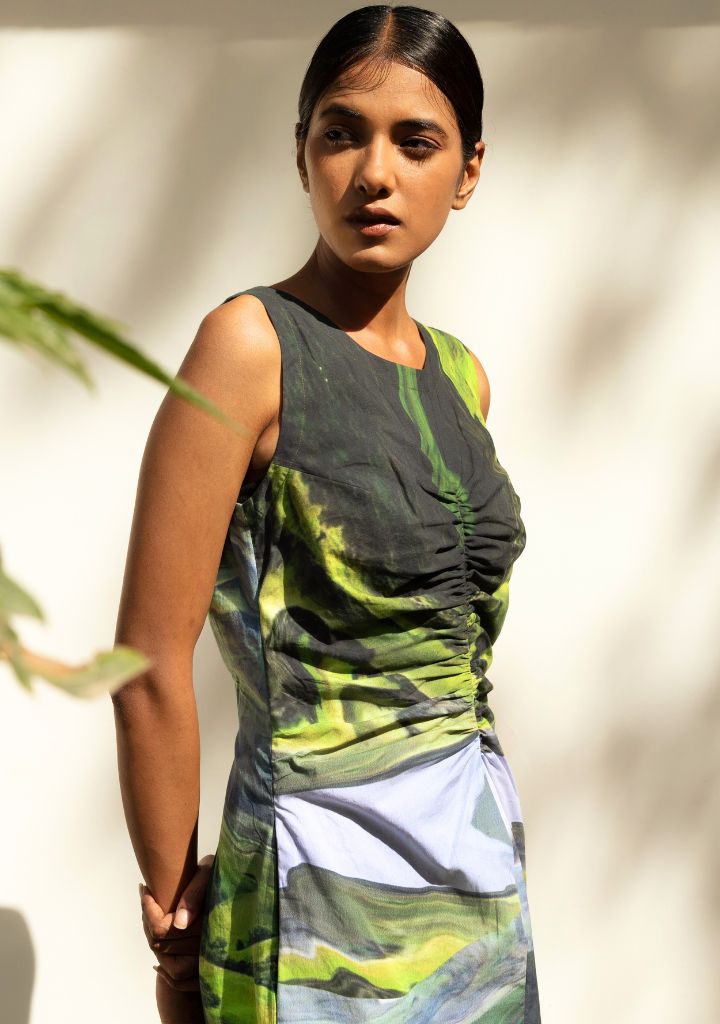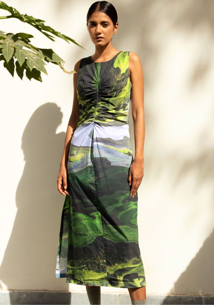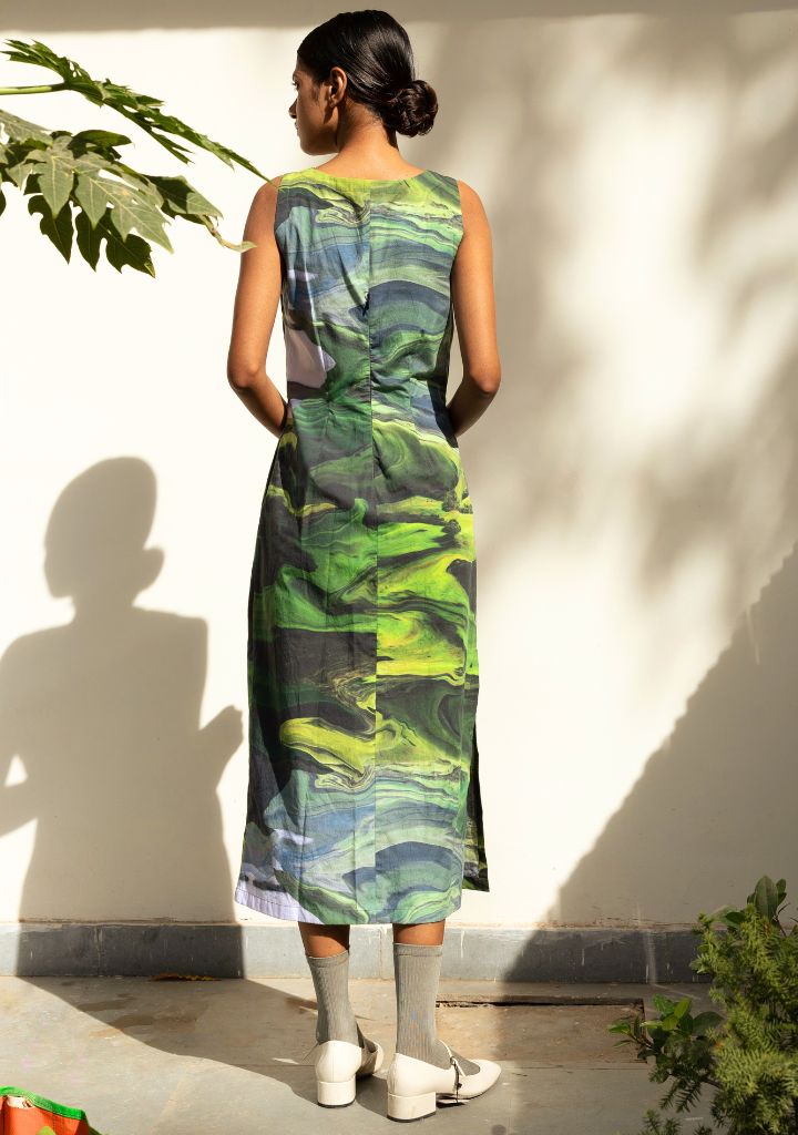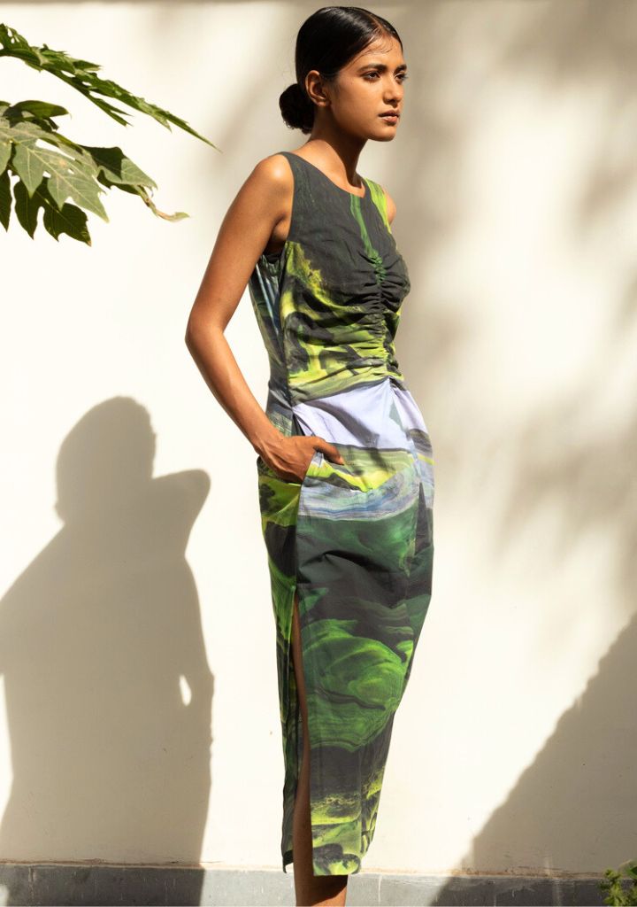 A printed midi dress with detailing in the front. Features a round neck, inseam pockets and a side slits. Length 50". The model is 5'5" and is wearing size M.