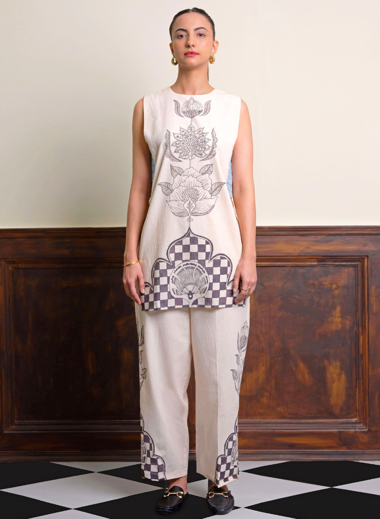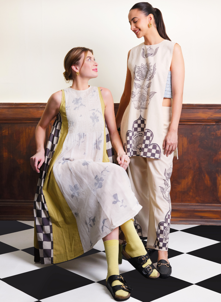 A straight top with a close neck, a low V neck and tie at the back. The whole piece is painted with kassim, and the side pintucks on Kota Doria and indigo blue. This panel is also hand-embellished with brass sequence. Length 32.5". The model is 5'8", and is wearing size S-M.