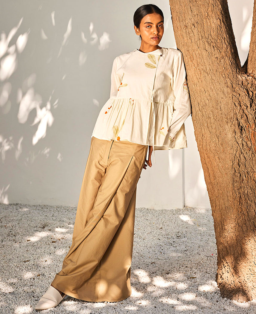 A printed top with gathered details featuring an overlap front knot and pleated cuffs. Length 24". The model is 5'8" and is wearing size S.