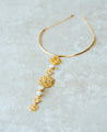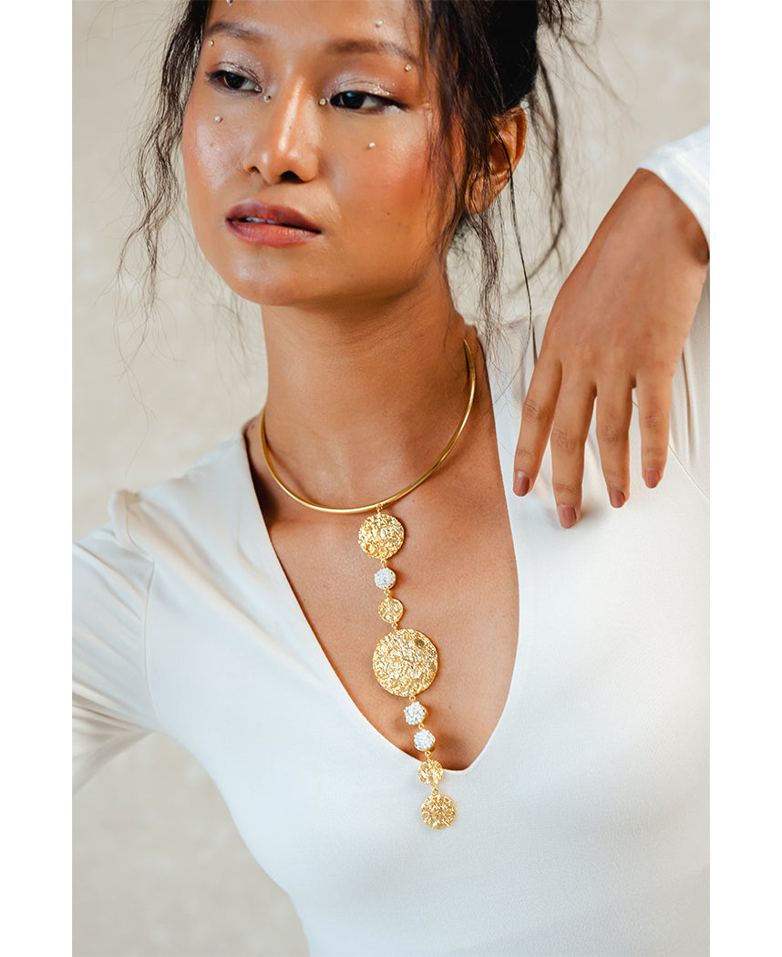 A drop-style choker with circular pieces and embellished glass beads, featuring an adjustable cord. Handcrafted in brass with nickel plating.