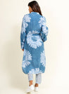 A batik floral printed midi tunic dress with front button-down placket, curved hem and side slits featuring a matching belt and side pockets. Length 38". The model is 5'9" and is wearing size M.