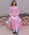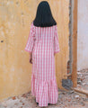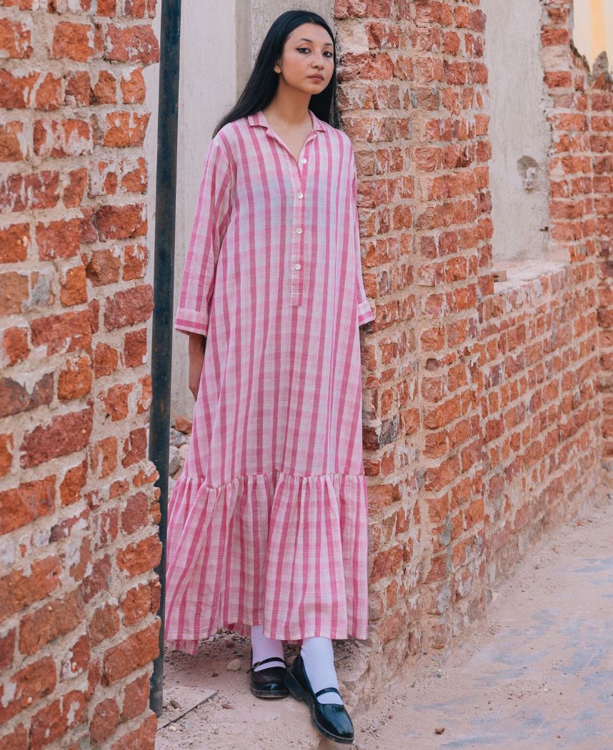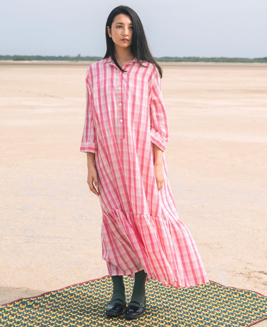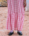 A checkered A-Line tiered dress featuring a collar and a front button placket. Length 51". The model is 5'6" and is wearing a size S.