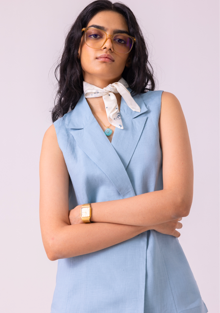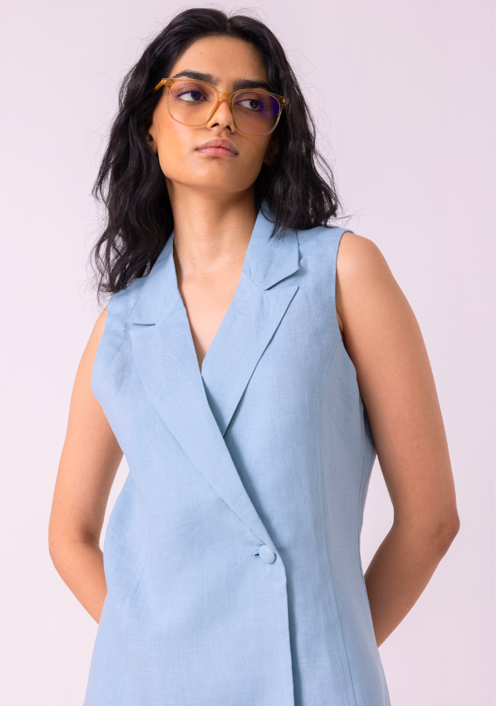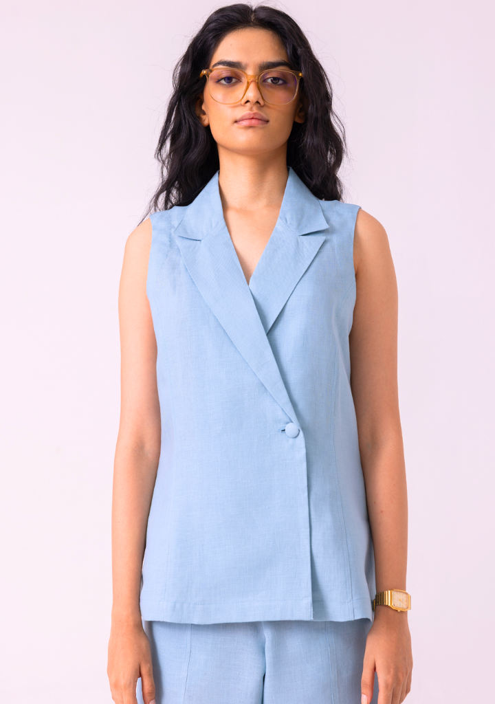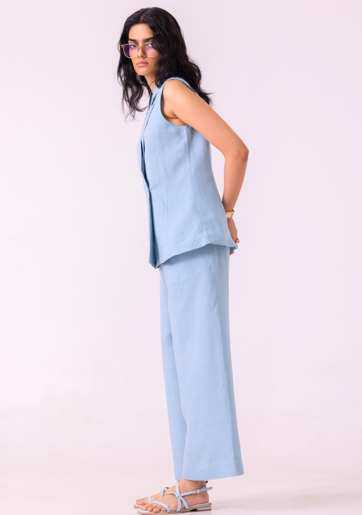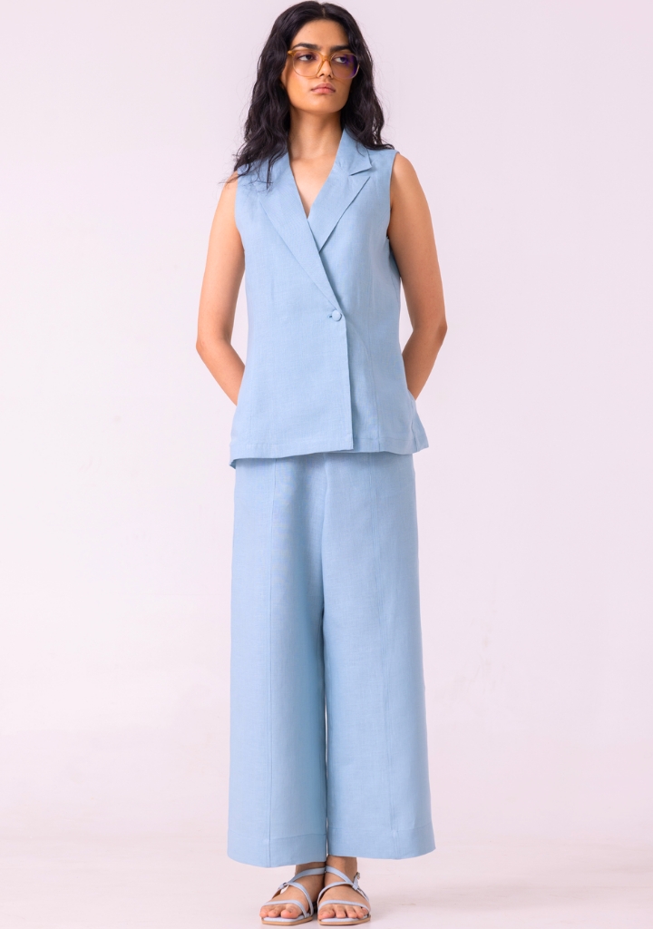 A two-piece set pairing the Serena Vest and the Moira Pants. The sleeveless top features a shawl collar and panelled waist for a cinched fit. The matching wide legged pants feature concealed hook, side zipper and in-seam pockets. The model is 5'8" and is wearing size XS.
