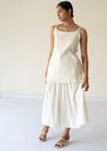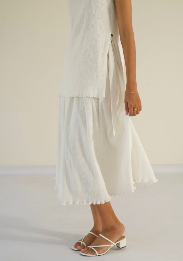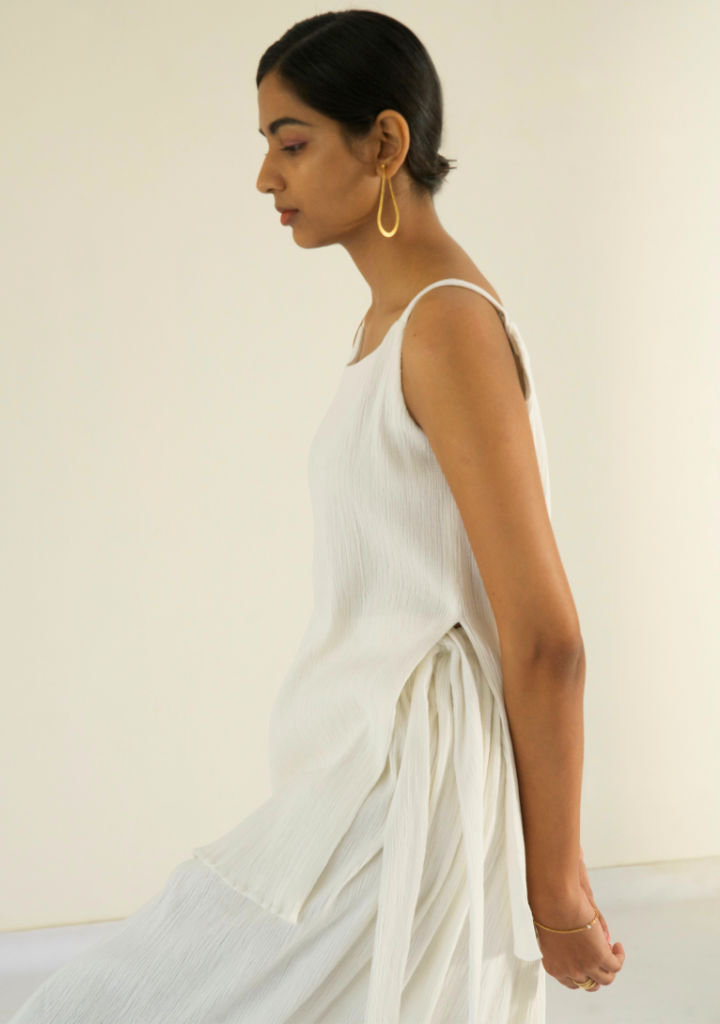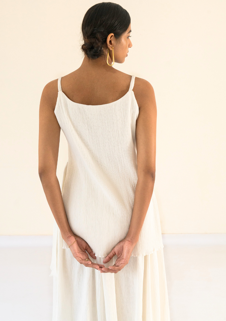 A straight-fitting top made in crinkled fabric with spaghetti shoulder straps and side slits featuring a wide round neckline. The model is 5'9" and is wearing size S.