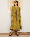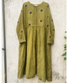 A gathered overdress with hand-embroidered flowers on the bodice and sleeves. Features a round neck and front buttons. Length 45". The model is wearing a size S. Made in 100% cotton corduroy, with cotton lining.