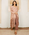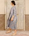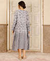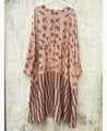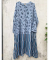 A gathered overdress with handblock printed flowers and displaced stripes. Features a round neck and front buttons. Length 45". The model is wearing a size S. Made in 100% organic soy fiber cotton.