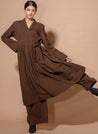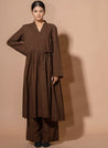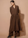 An overlapping dress with side tie-up detail and a gathered waist featuring a shawl collar and long sleeves. The model is 5'6" and is wearing size S.