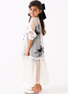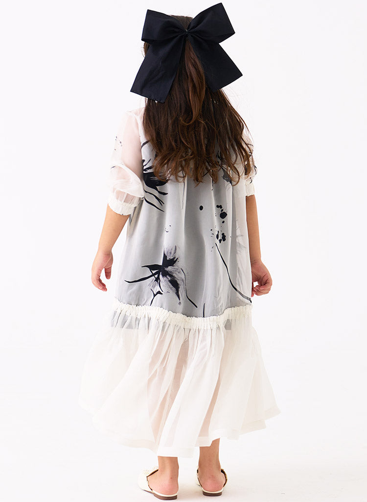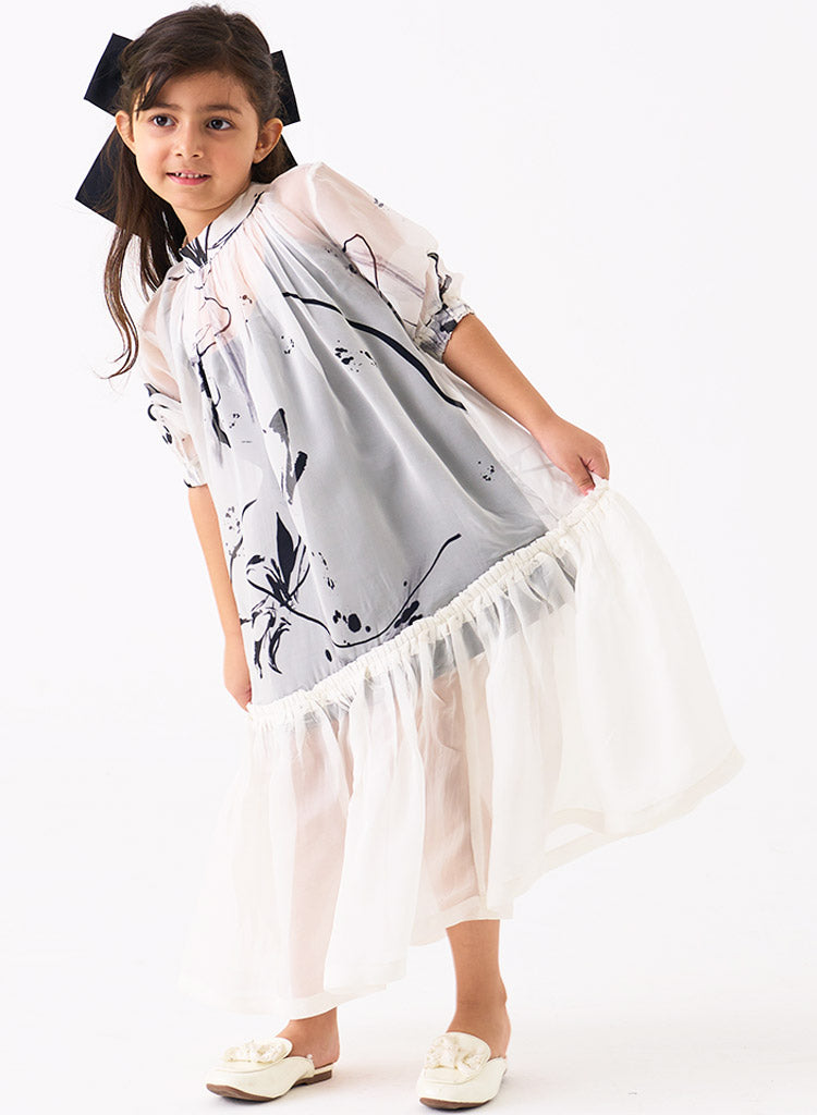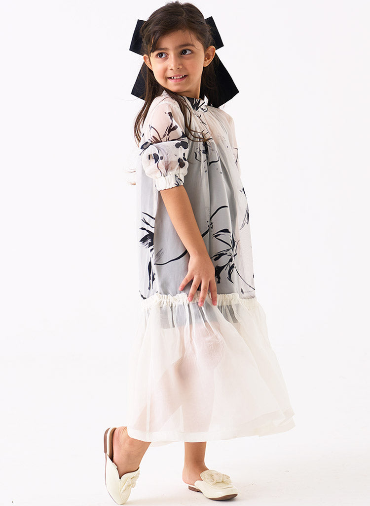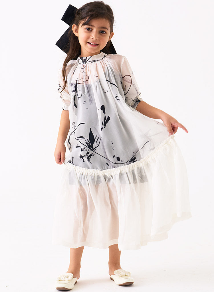 A tiered dress with a gathered neck and hem featuring a high round neckline, back keyhole opening and short sleeves with an elasticated hem.