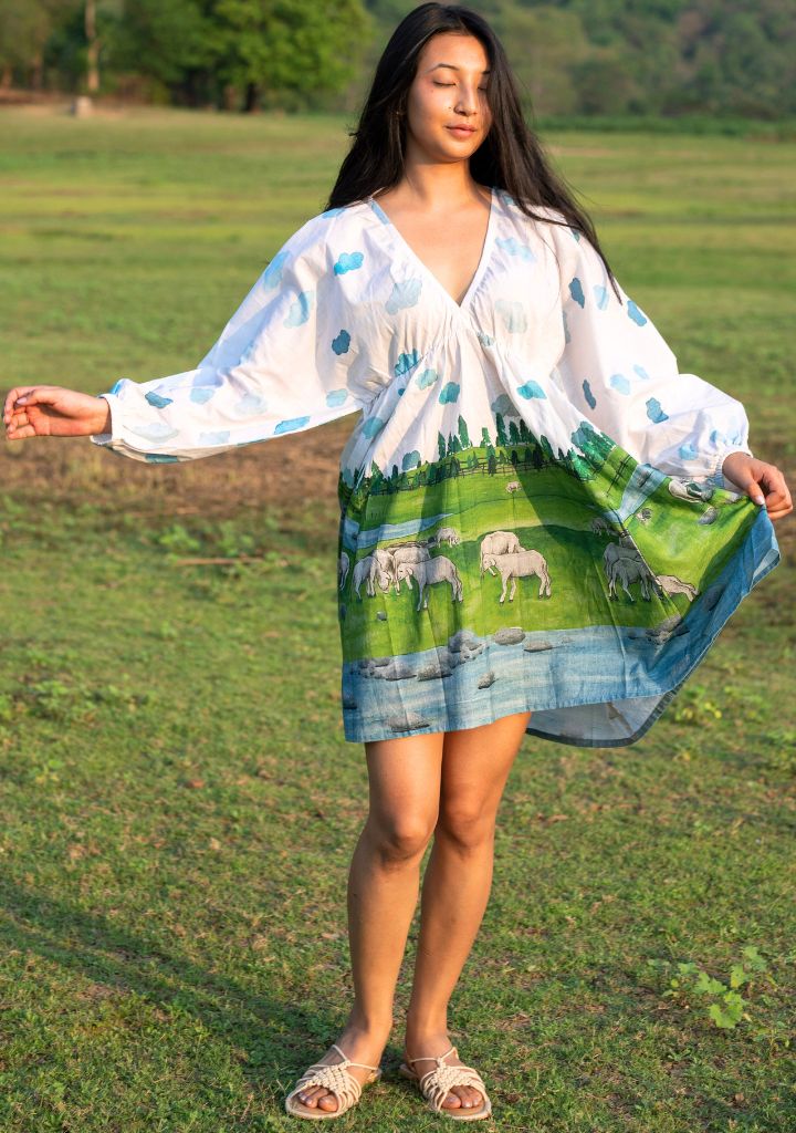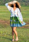 A digitally printed mini dress featuring a V-neck, an elasticated under bust and elasticated sleeves. Length 34". The model is 5'3" and is wearing a size S.