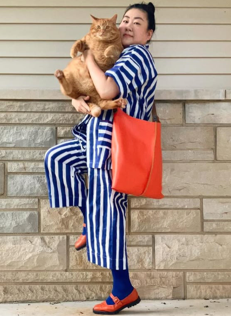 A two-piece set pairing the Shiro Shirt and the Kylo Pants. The relaxed fitting striped shirt with hand embroidered rose flower detail features a lapel collar, a front button placket and kimono sleeves. Length 32". The matching striped straight trousers feature waistband with elastic back, front pleats, zip fly and top button fastening. Length 38". The model is 5'7" and is wearing a size M.