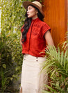 A cap sleeve shirt with ruching detail and a concealed front button-down placket featuring a buttoned high neck and slight gathers at the back yoke. Length 20". The model is 5'11" and is wearing size M.