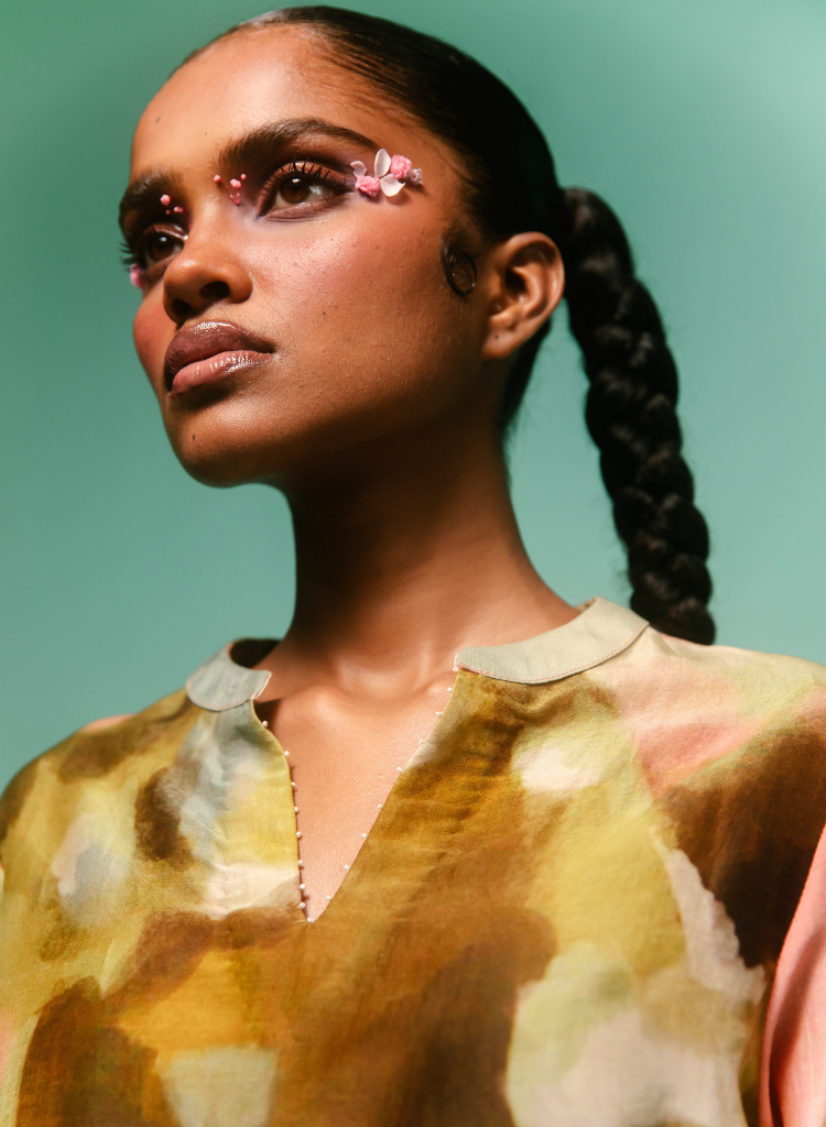 A two-piece set pairing a Sia Tunic and the Sia Pants. The short kurta with embellishments at the neck features a curved hem and side slits. Length 29.5". Made in Chanderi. The relaxed fitted pants features an elasticated waist and inseam pockets. Length 39". Made in Muslin.