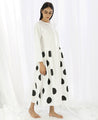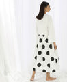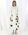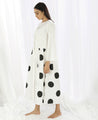 A relaxed A-line dress with bell sleeves and gathered polka dot panels on the sides. Made in cotton poplin. Features a round neck and concealed front placket. Length 48.5".