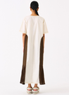A maxi dress with a floral motif, knife pleat hem side panels and top stitch details featuring a round neck with a slit in the centre and short sleeves. Length 50". The model is 5'7" & is wearing size S.