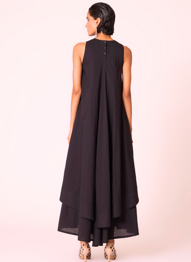 A sleeveless dress featuring in-cut shoulder, back button fastening with placket and in-seam pockets. The model is 5'8" and is wearing size XS.