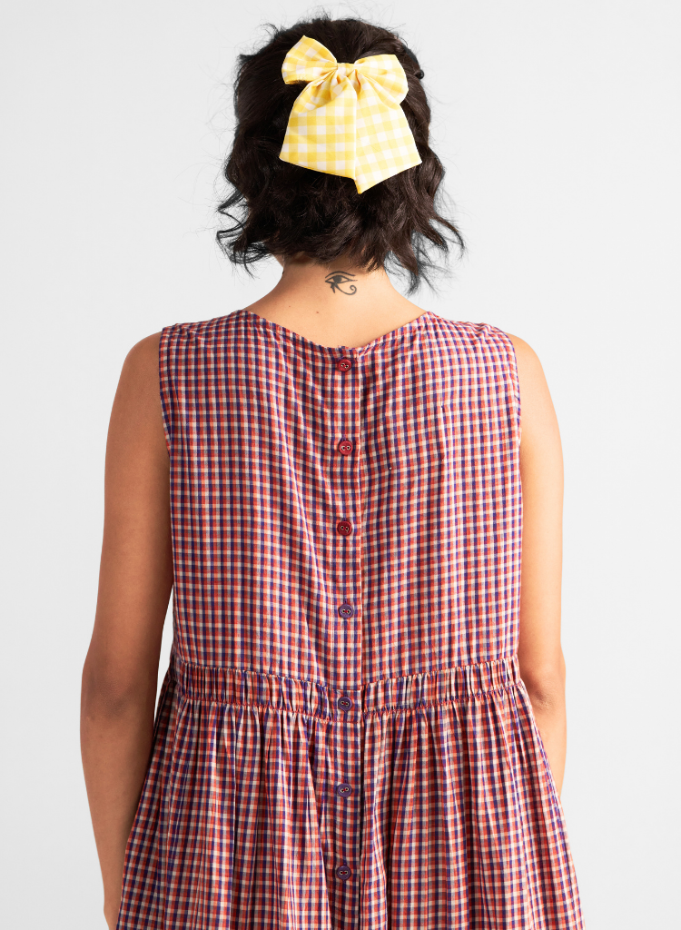 A relaxed fitting midi dress with a contrast hem featuring a round neck, back button placket and inseam pockets. Length 44". The model is 5'6" and is wearing a size XS.