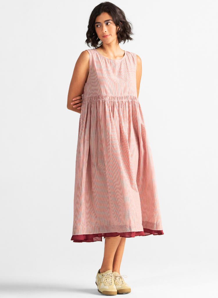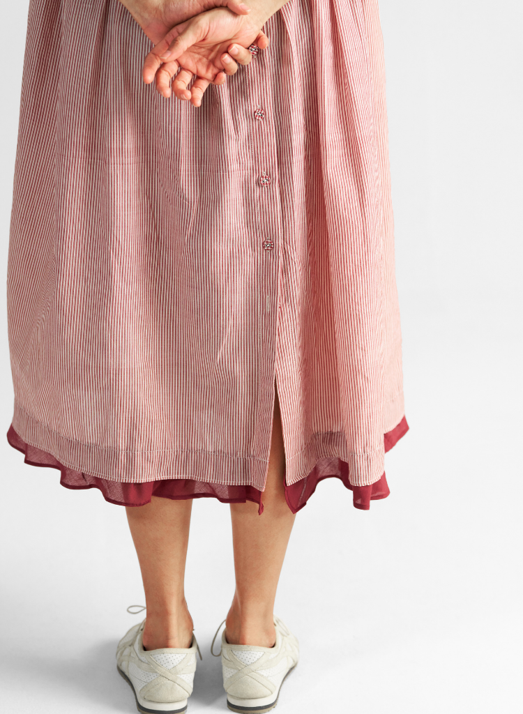 A relaxed fitting midi dress with a contrast hem featuring a round neck, back button placket and inseam pockets. Length 44". The model is 5'6" and is wearing a size XS.