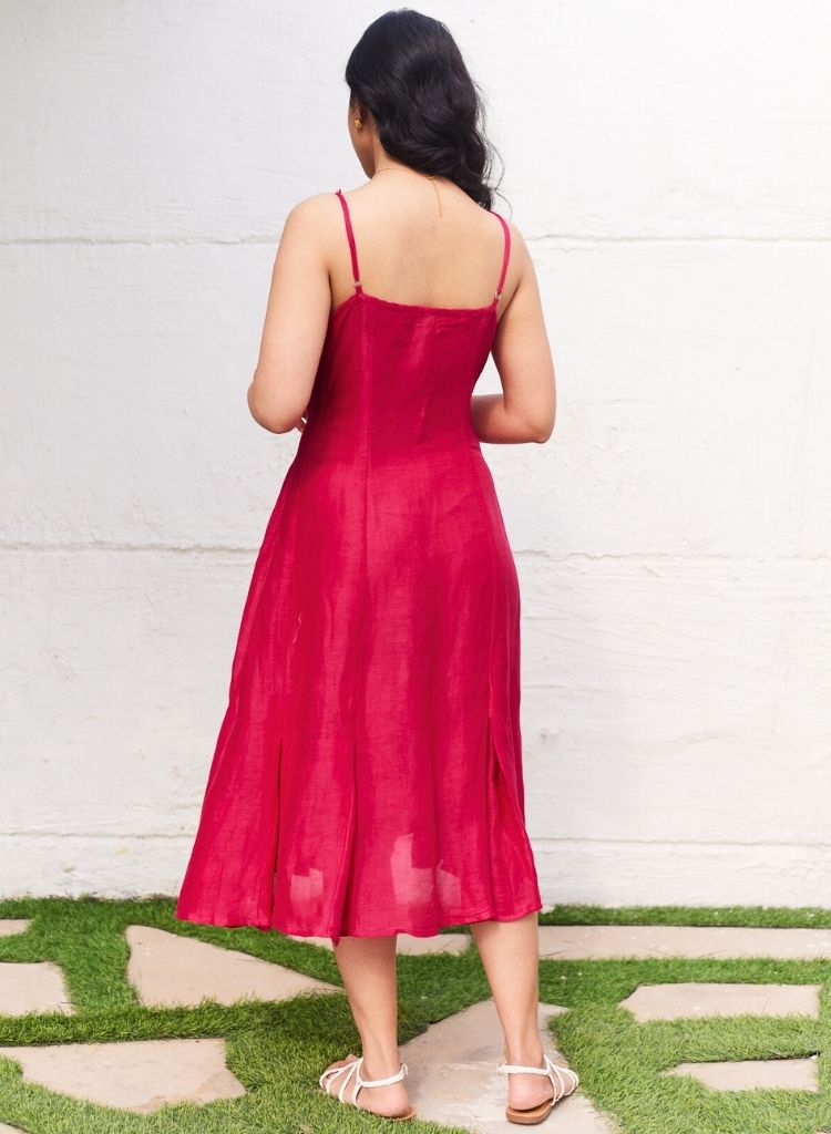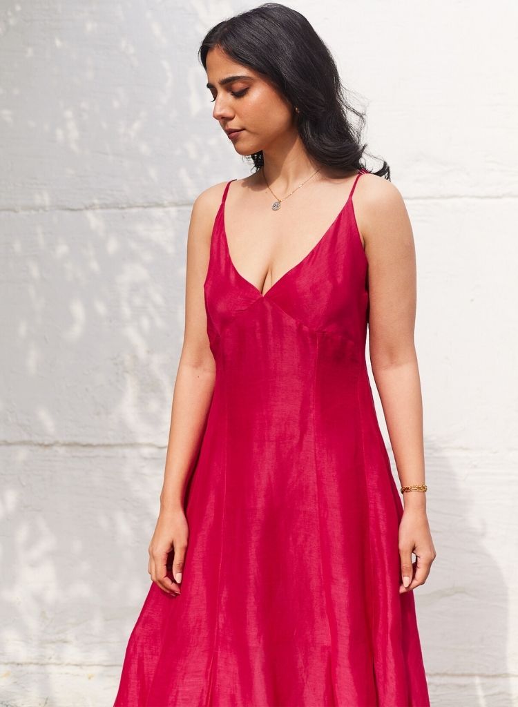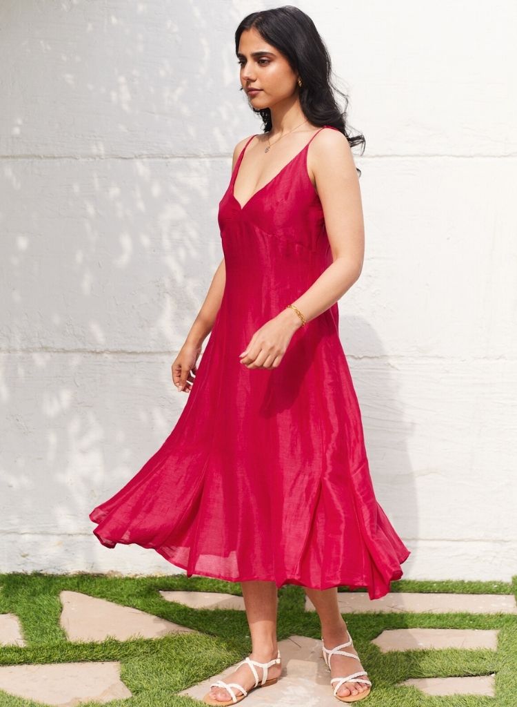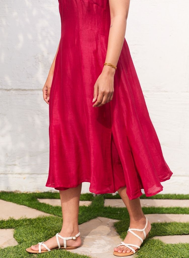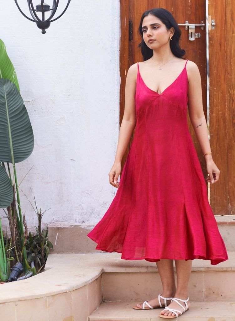 A chic midi dress with thin shoulder straps, stitched panels and flared hem featuring a plunging neckline and side concealed zipper fastening. Length 41". The model is 5'6" and is wearing size S.