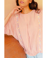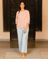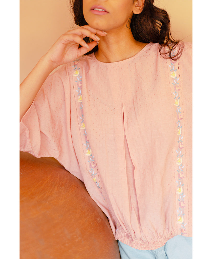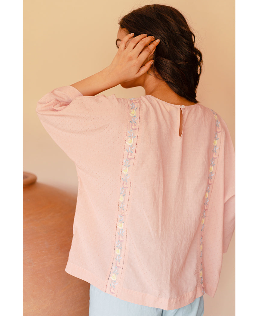 A two-piece set pairing the Sol Top and Mindy Pants. The relaxed crop top features hand embroidered flowers, an elasticated hem, boxy sleeves, and a keyhole button at the back. Length 23". Made in 100% organic bamboo fiber cotton. The wide-leg pants feature a front zipper, elasticated back and inseam pockets. Length 35". Made in 100% cotton. The model is wearing size S.