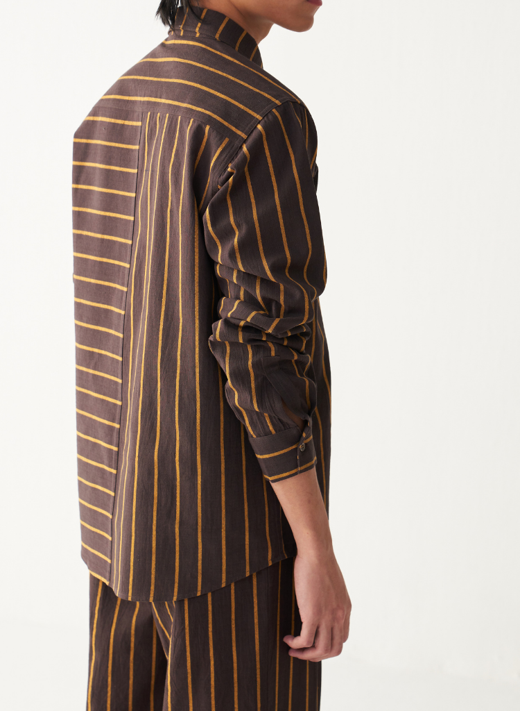A button down shirt featuring a contrast panel detail and a pointed collar. Length 28". The model is 5'10" and is wearing a size M.