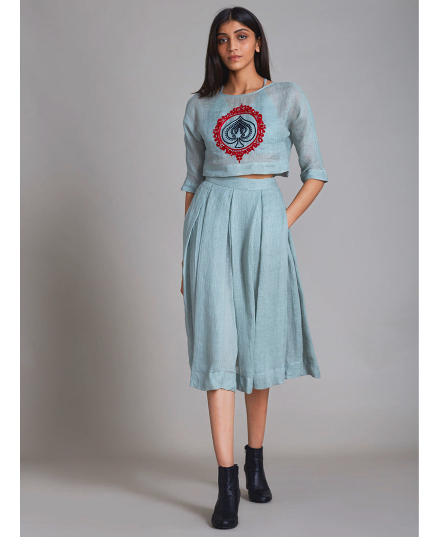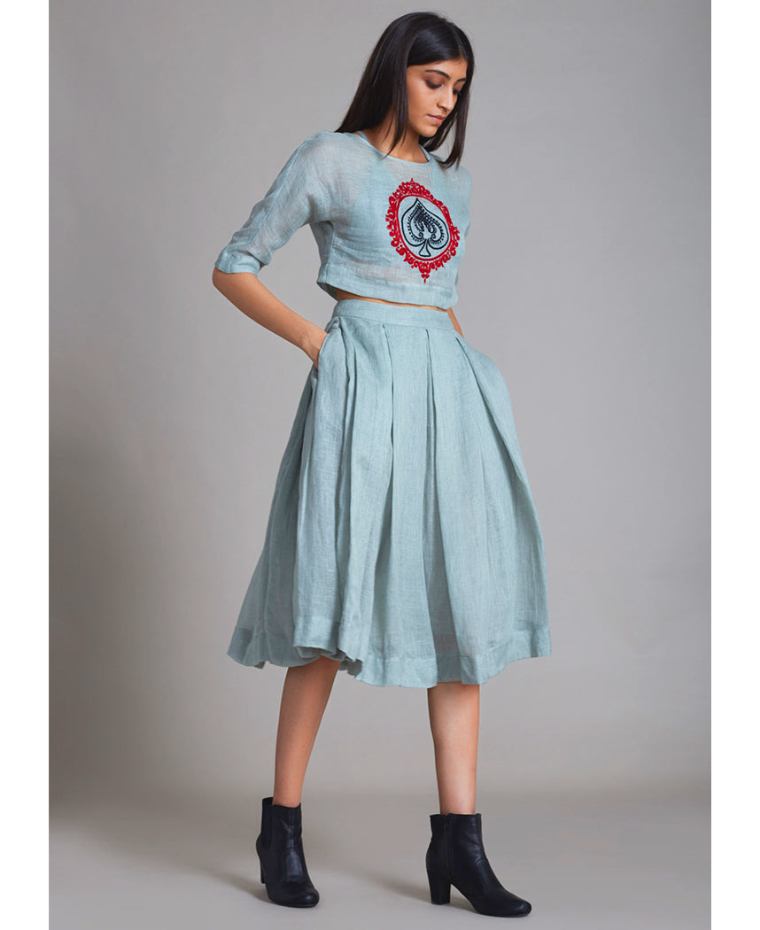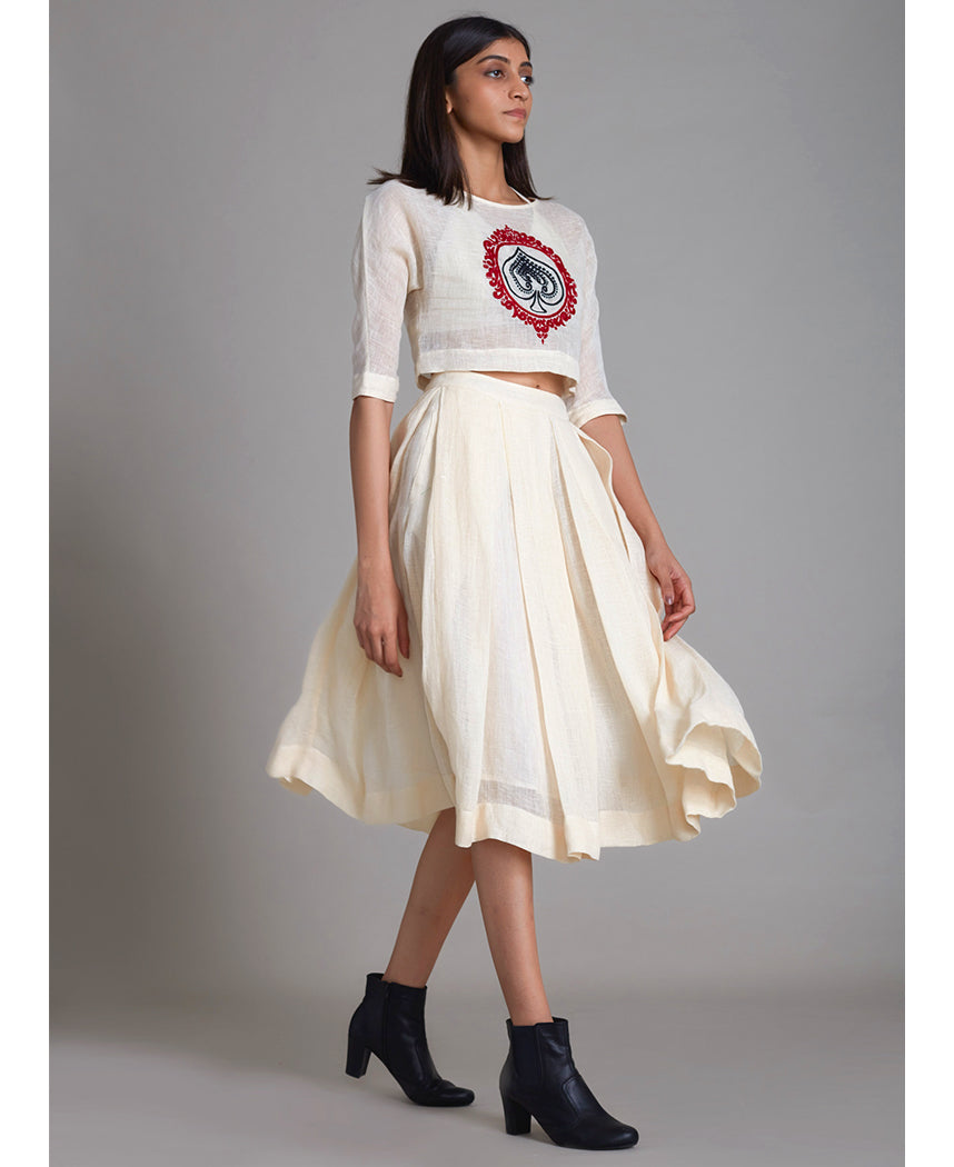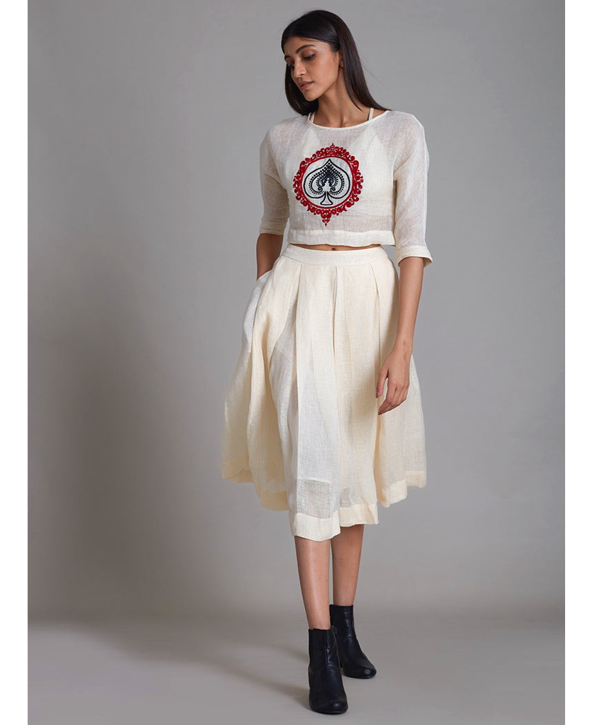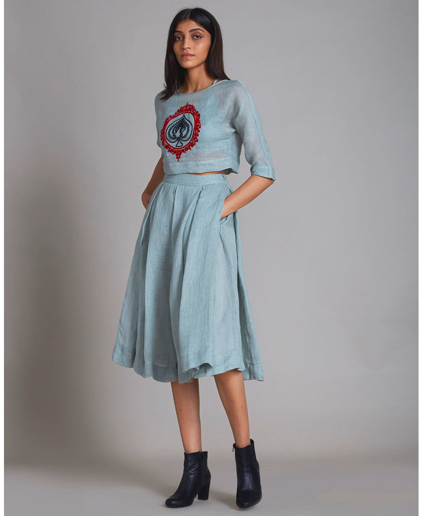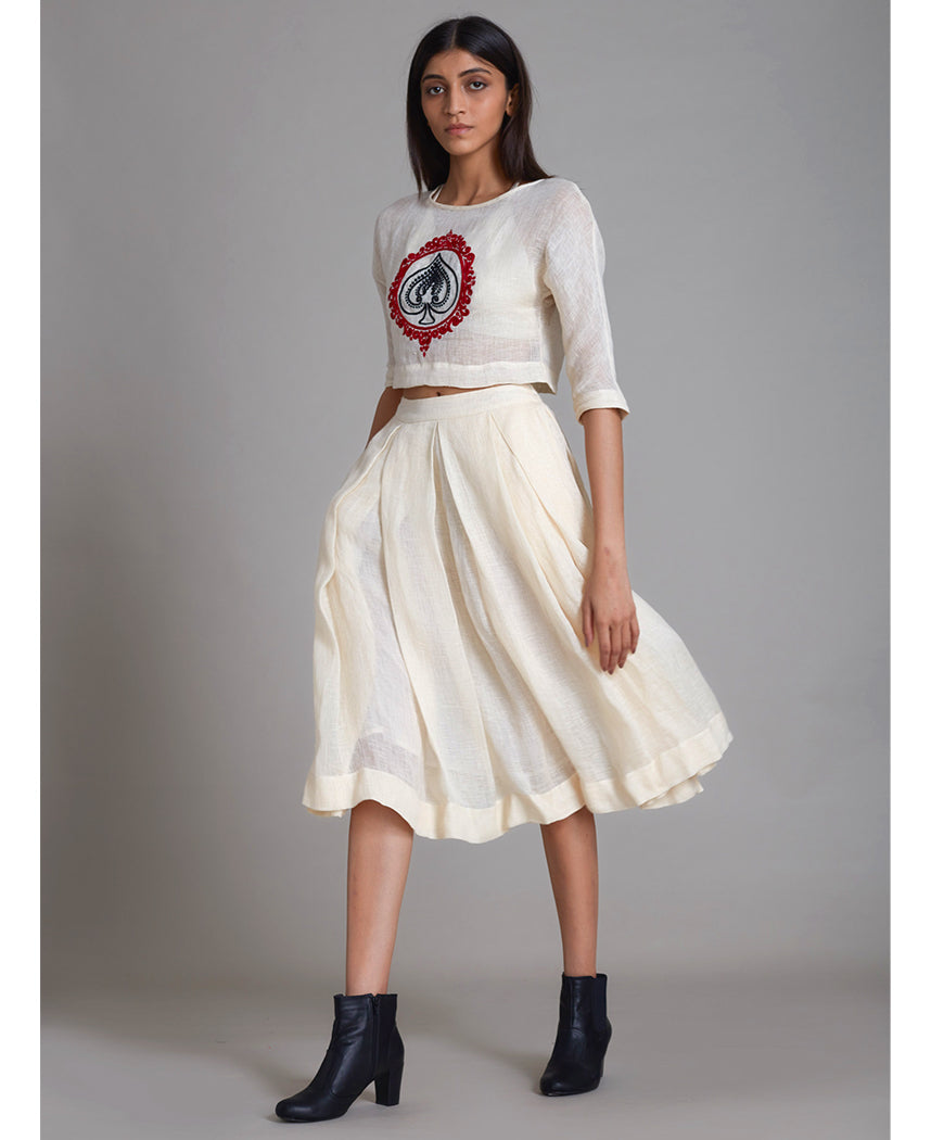 A crop top with thread hand embroidery featuring a boat neck and a spade motif on the bodice. Length 15".