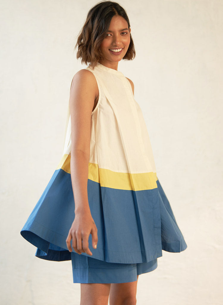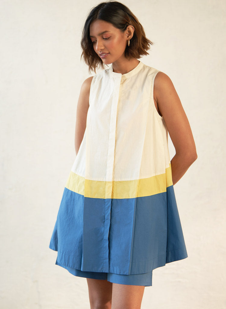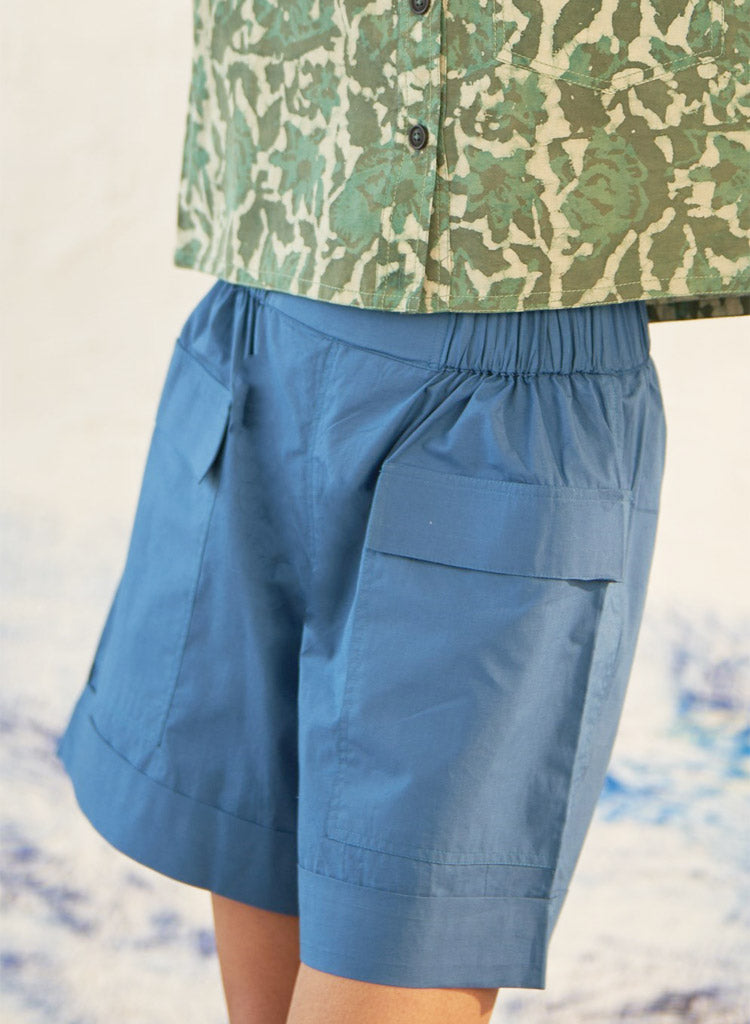 A two piece set pairing a flared top and matching shorts. The flared top features a band collar and a front button placket. Length 29". The matching shorts a half-elasticated waistband and flap pockets. Length 26". The model is 5'9" and is wearing size S.