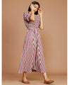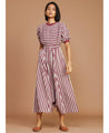 A comfortable striped jumpsuit with wide harem style legs and rib details at the neck and sleeves. Features an elasticated waist, a back button placket and roomy front pockets. Length 52". The model is 5'9", and is wearing size XS.