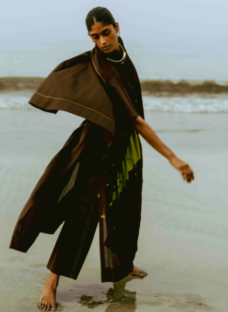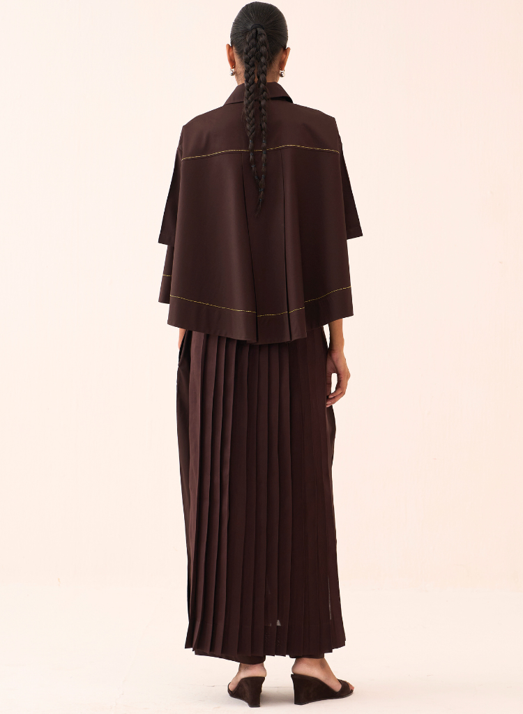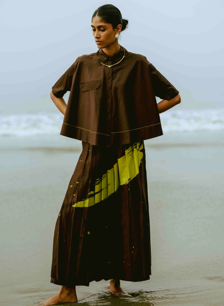 A two-piece set pairing the Wide Hem Shirt and the Splash Print Skirt Pants. The regular fit shirt features a button front and stitching detail. Length 22". Made in cotton poplin. Skirt Pants have a pleated top layer with straight pants inside and side pockets with an elasticated back. Skirt full length 38". Pant full length 40". Made in cotton poplin and Chanderi.