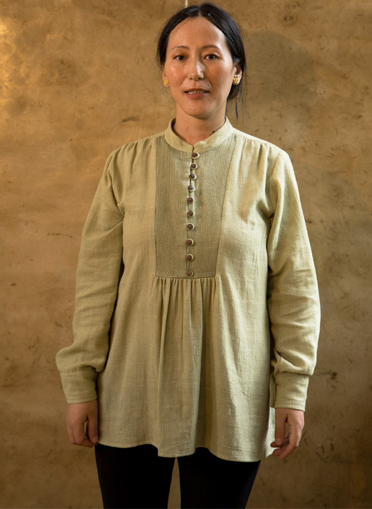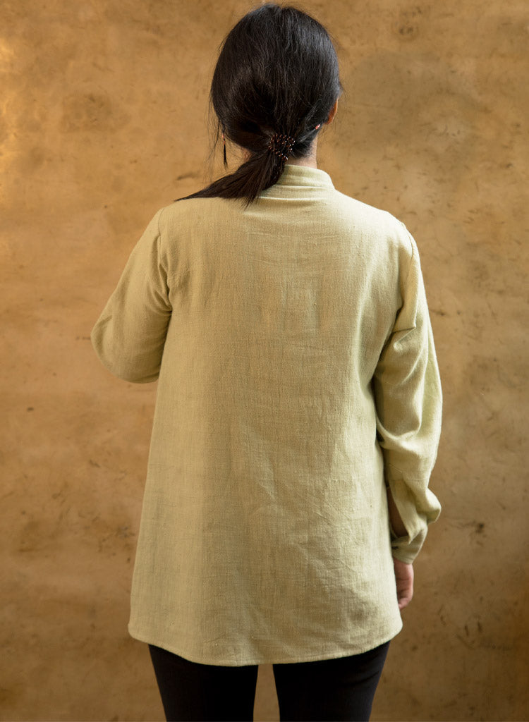 A lightweight, stand-collar kurta featuring hand-embroidered details and a wrap-around button closure. Length 28.5". The model is 5'5" and is wearing size M.