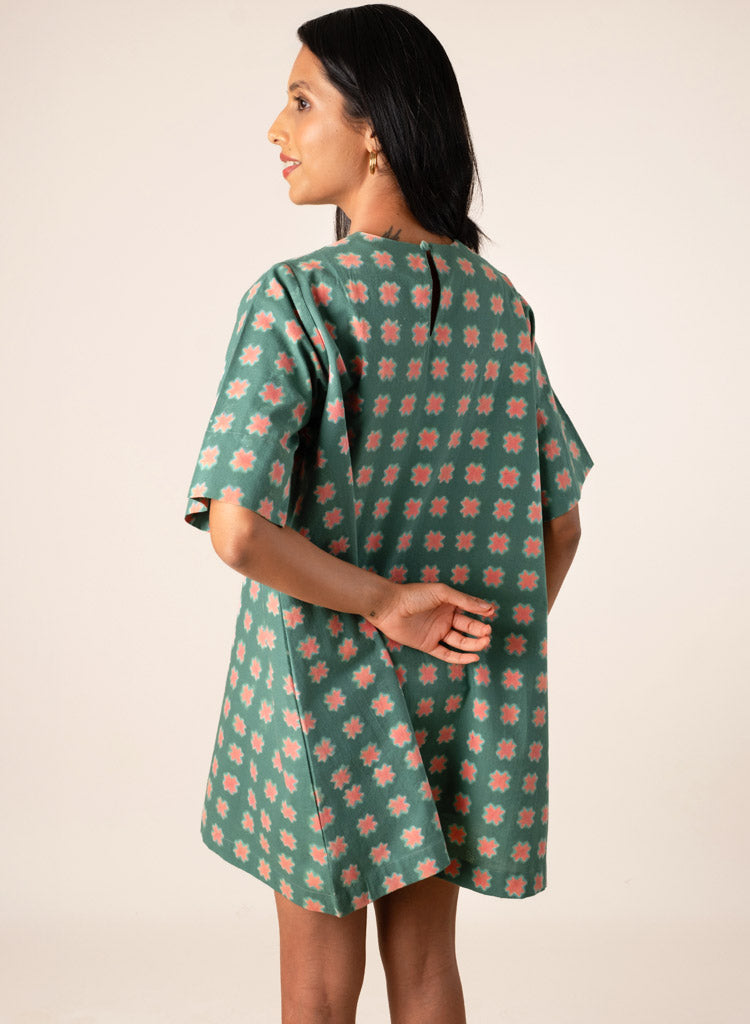 A floral hand-block printed boxy dress featuring a round neck. The model is 5'7" and is wearing size XS.