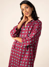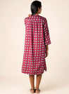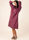 A relaxed fitting floral midi dress with neckties and 3/4th sleeves. Length 42.5". The model is 5'7" and is wearing size XS.