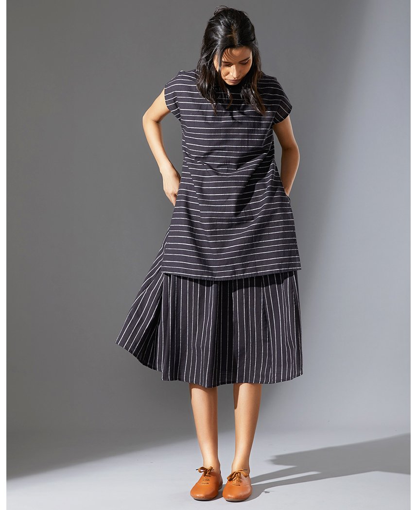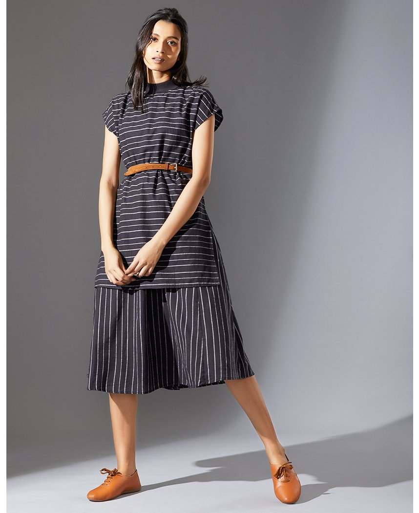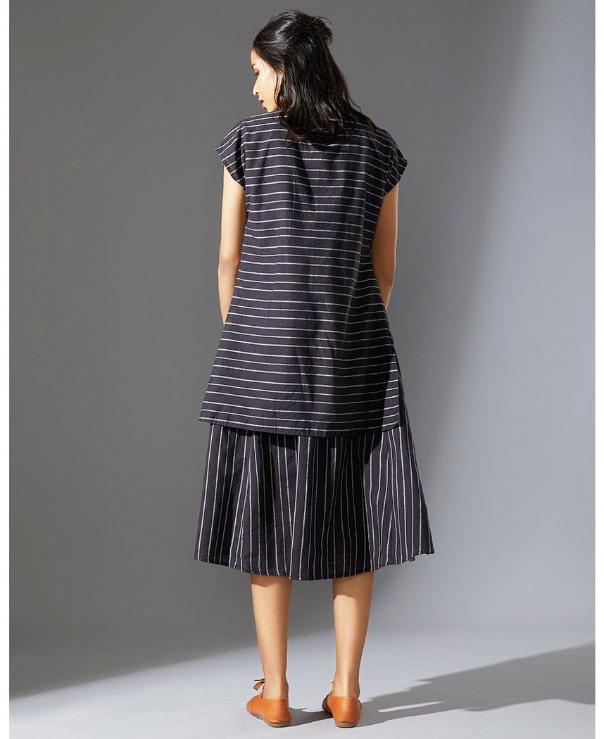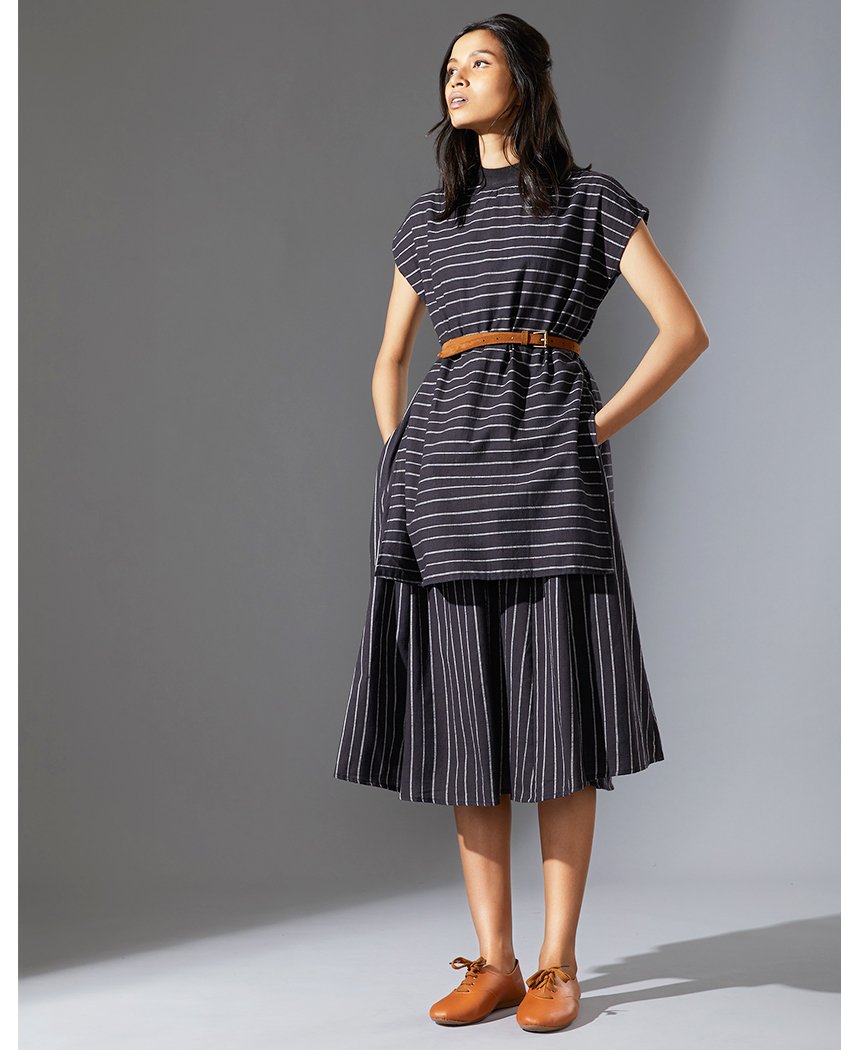 A fun striped dress layered to look like a top and skirt. Features a ribbed T-shirt neck, cap sleeves and inseam pockets. Length 49".