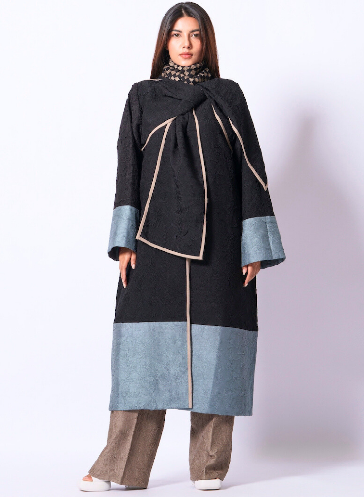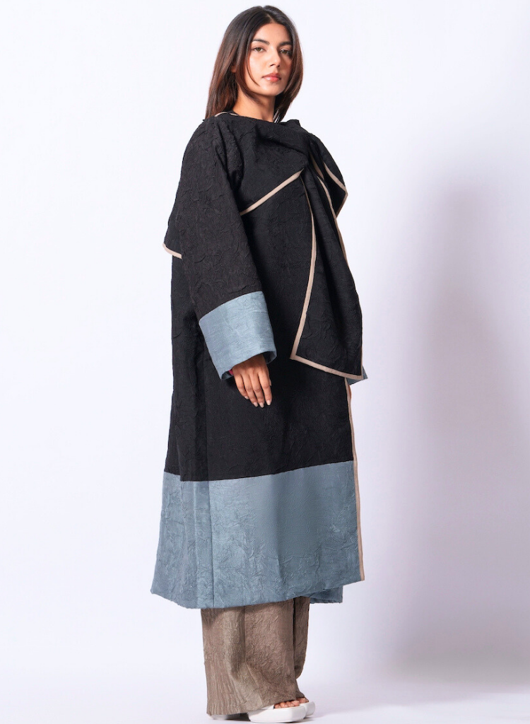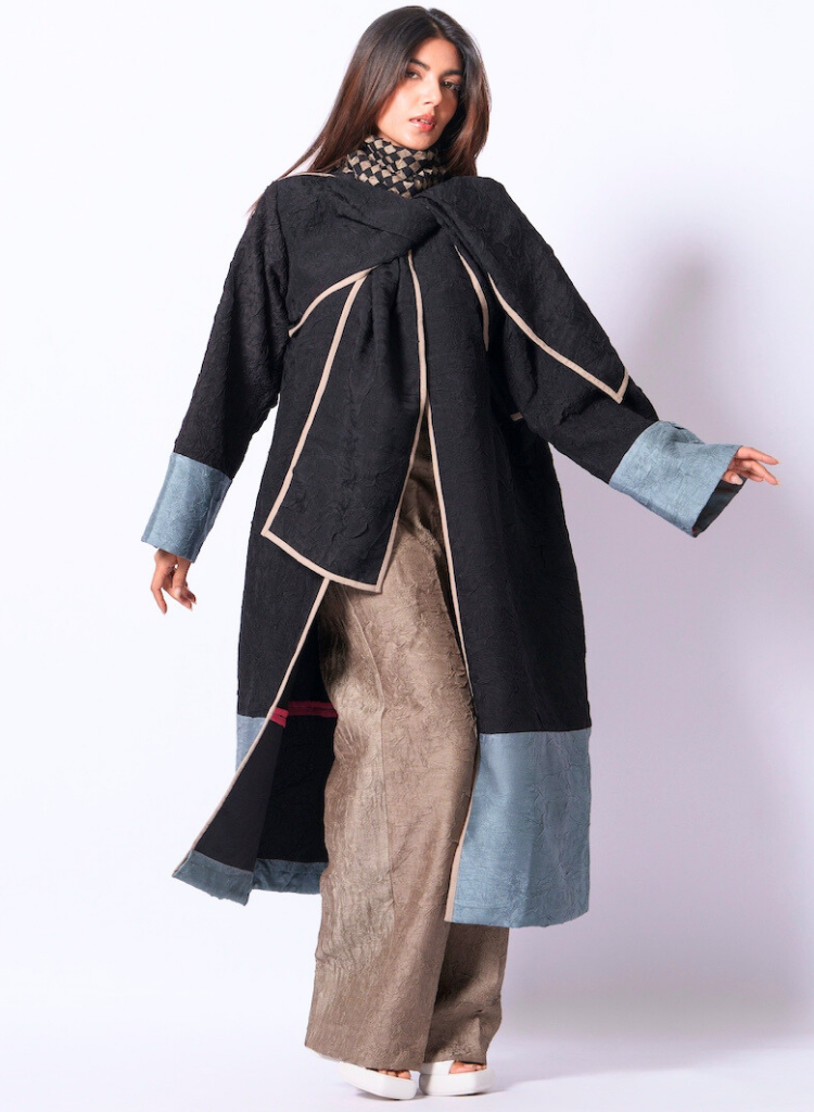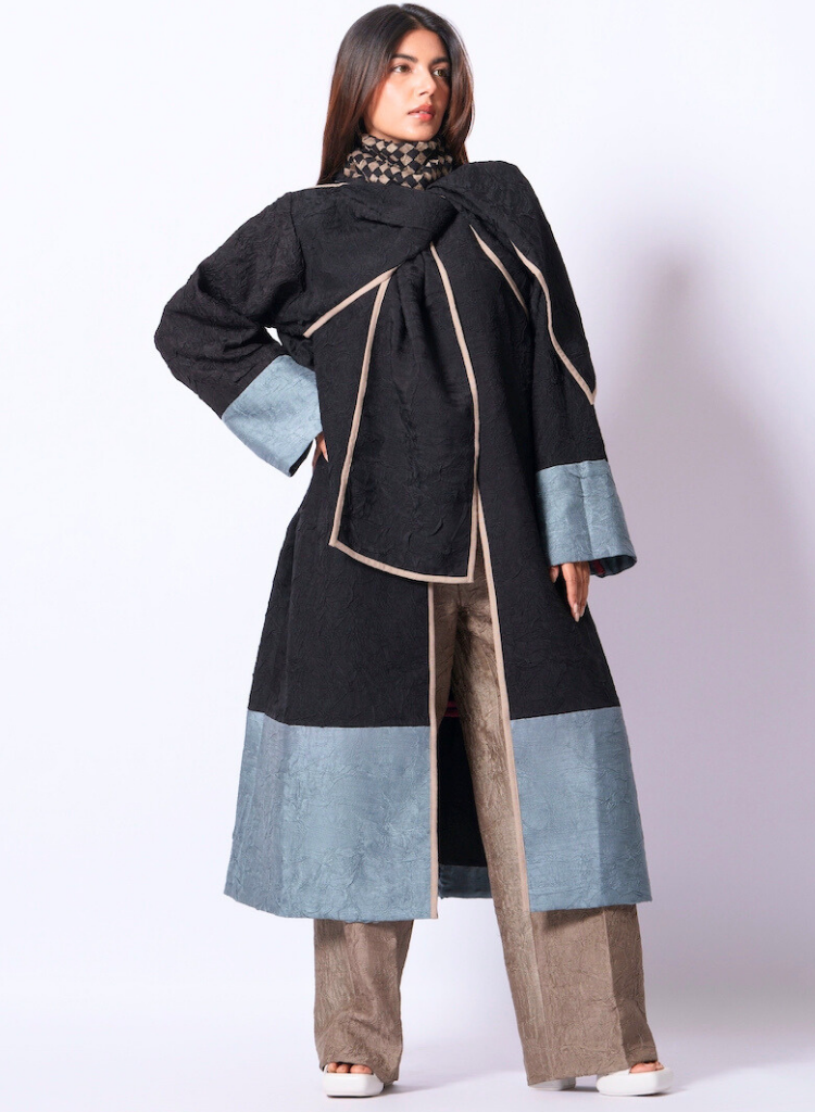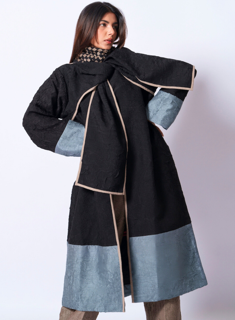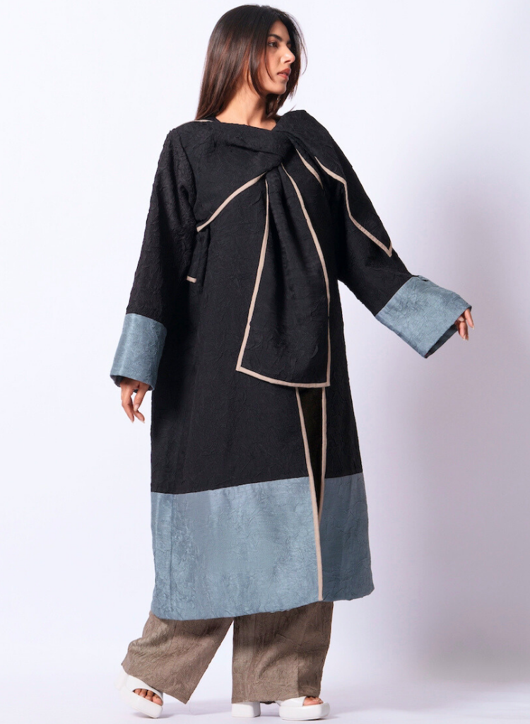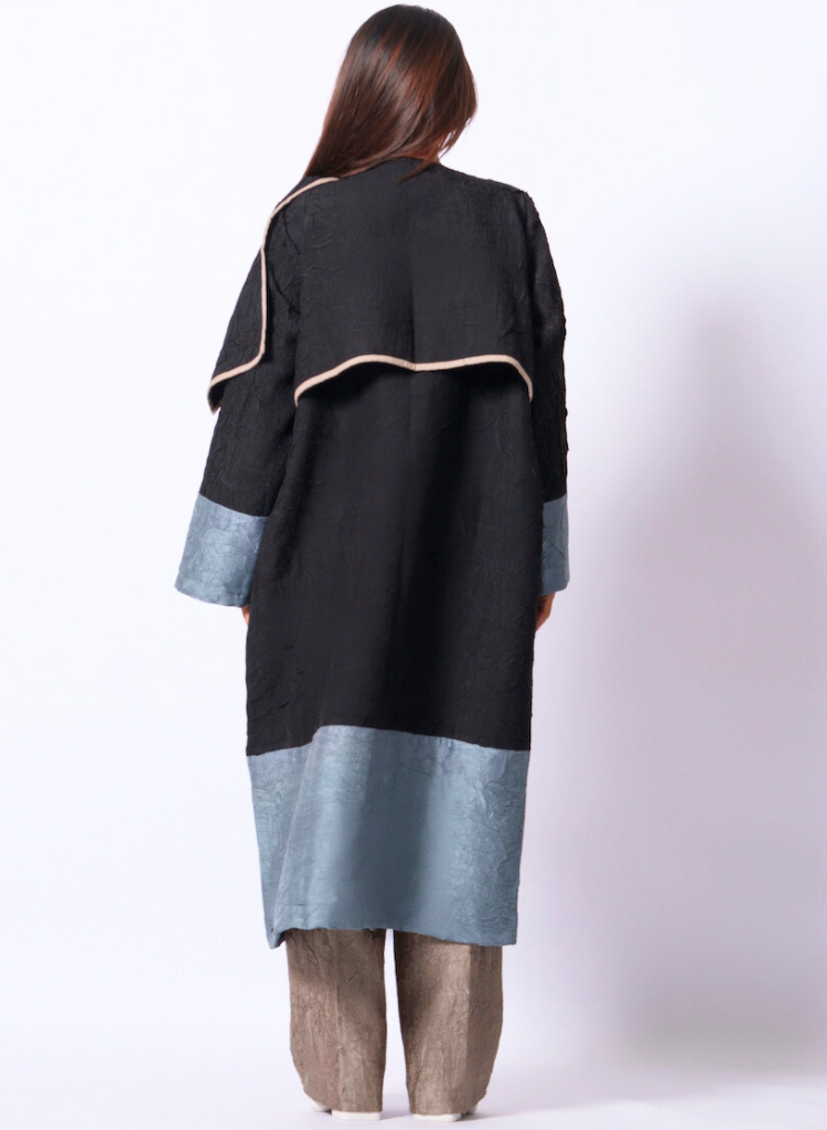 A relaxed fitting overlay featuring striking color blocking and front tie-up detail. Length 48". The model is 5'8" and is wearing S.