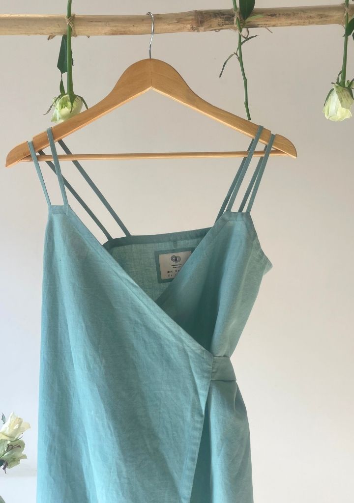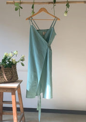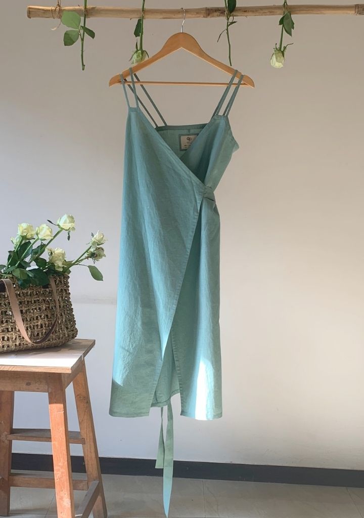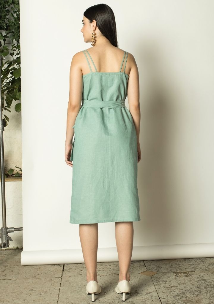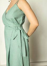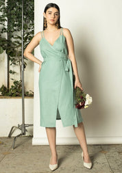 A wrap-style midi dress with an attached belt for tie-up to create a cinched waist and double shoulder straps featuring a V-neckline and side seam pockets. The model is 5'7" and is wearing a size S. Length 43"- 45.5".